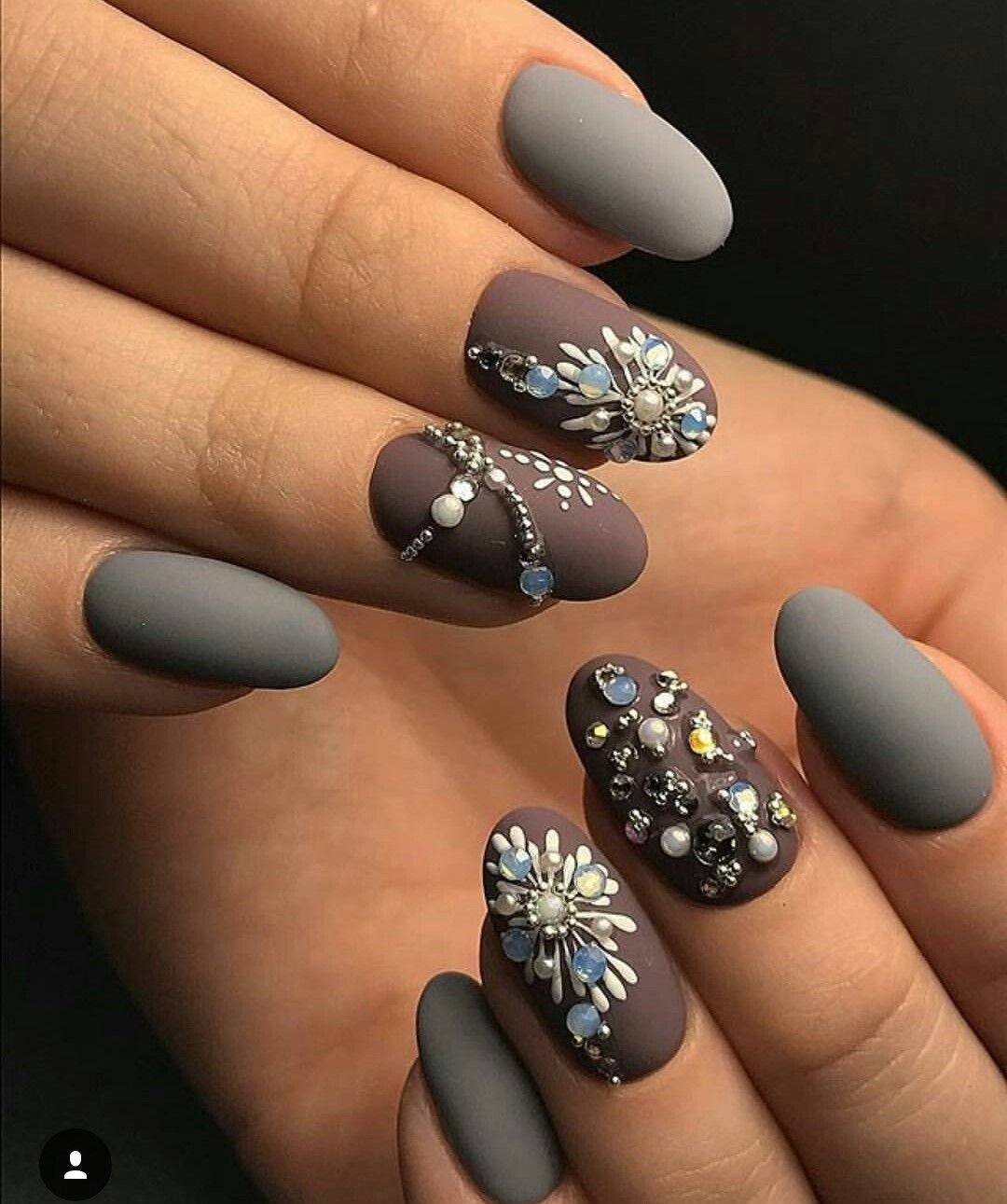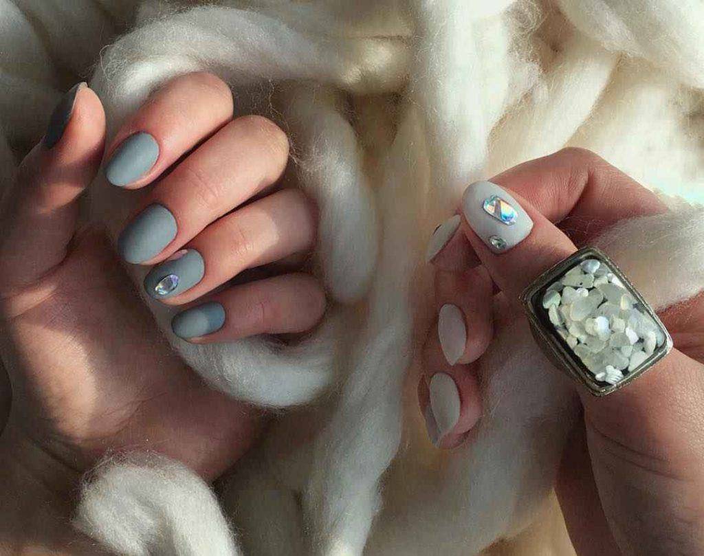 Этот маникюр выглядит стильно и сексуально. Если вы одна из тех невест, которые любят выставлять напоказ и удивлять своим внешним видом, тогда вам нужно сделать этот дизайн маникюра. Базовый цвет – серый с матовым верхним слоем. Затем добавьте немного призматического, серебряного блеска на безыменный палец.