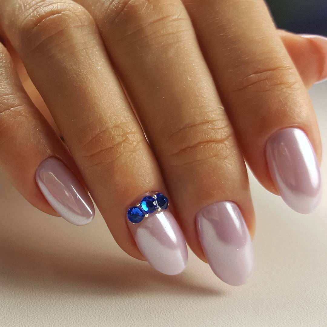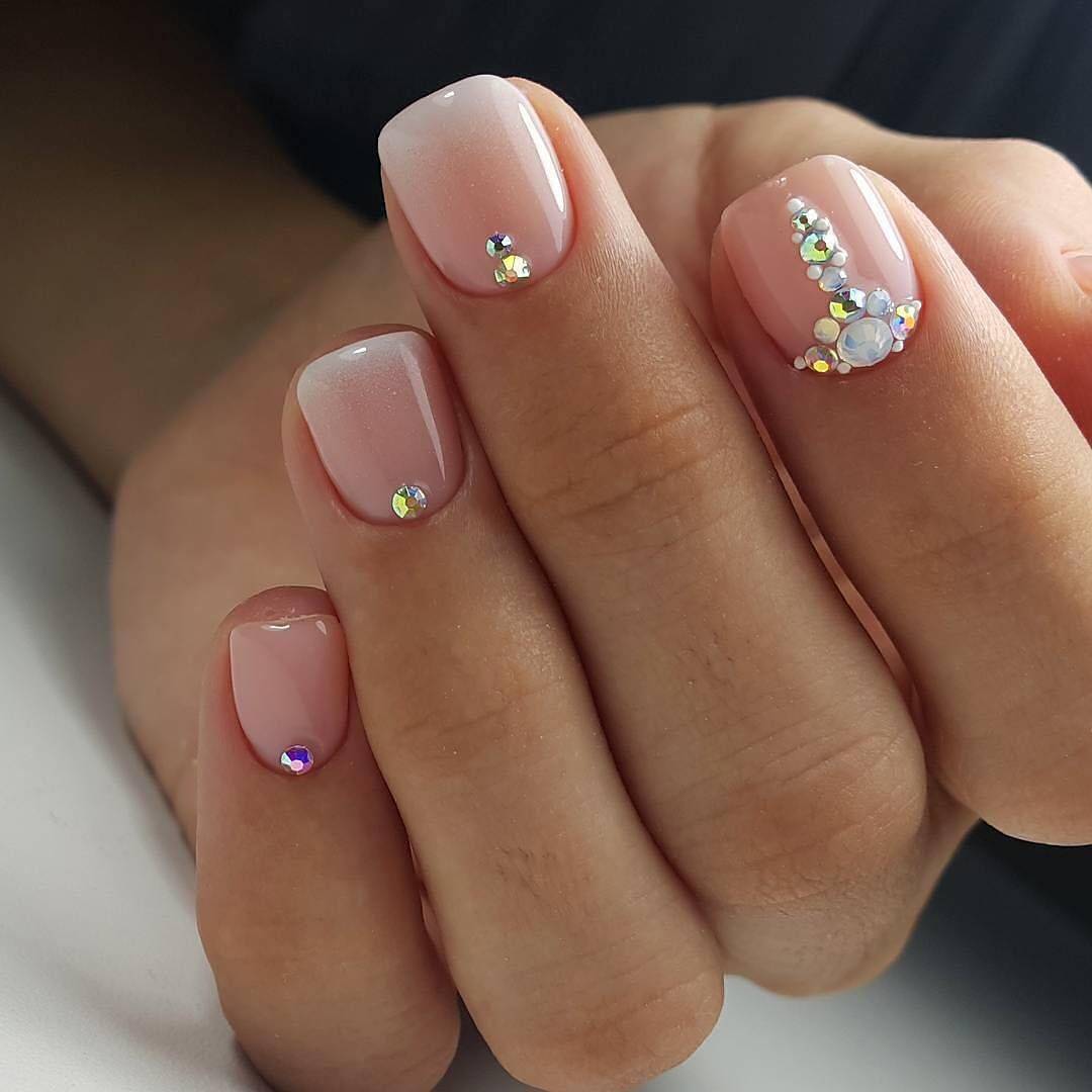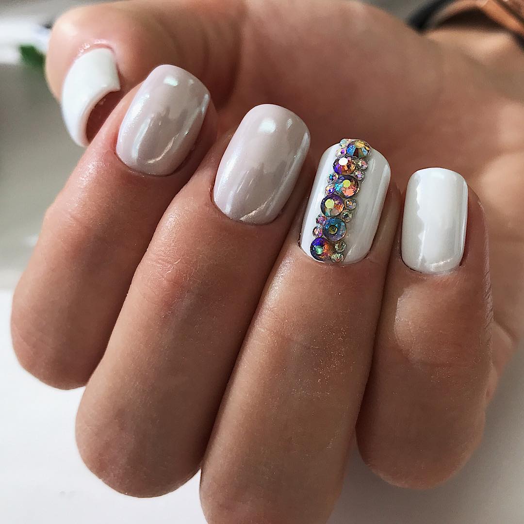 Если хочется чего-то более легкого и простого, то можно покрыть все ноготки бледно-розовым, молочным или нюдовым гель-лаком, и один или два ногтя украсить светлыми стразами или блестками.