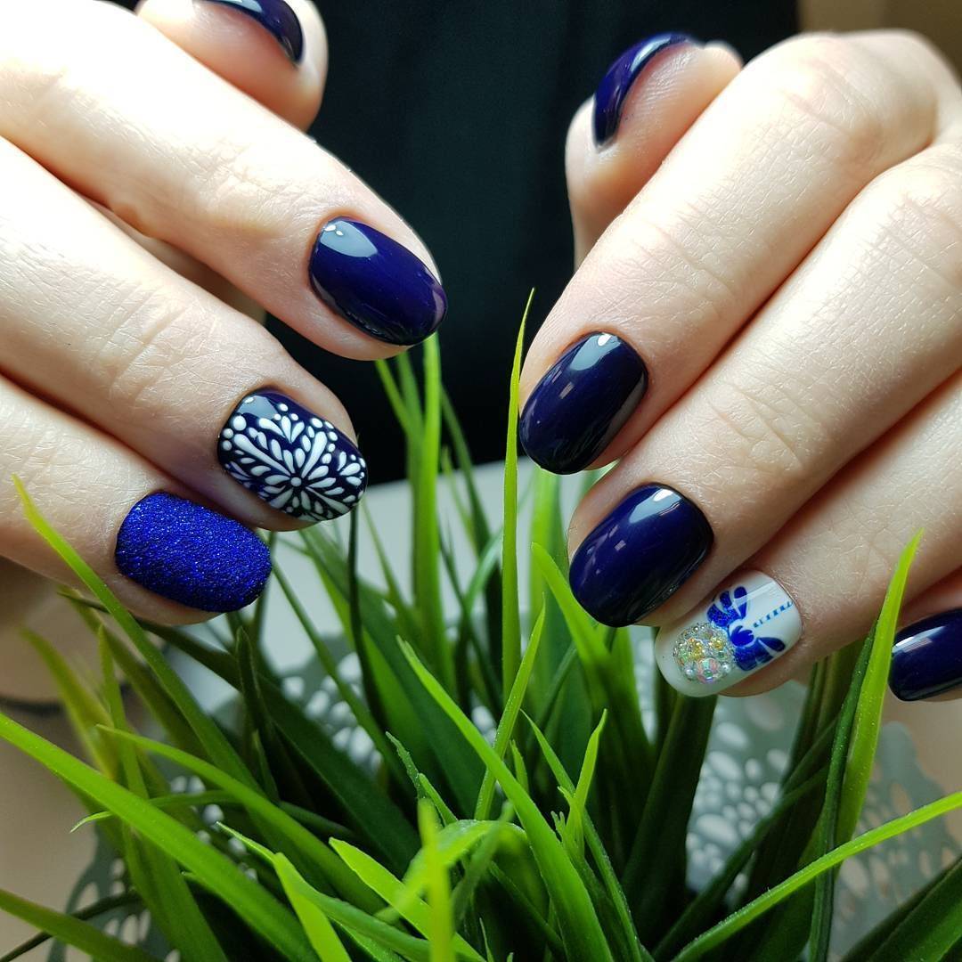 Окрашенные двумя или несколькими цветами ногти также должны быть красиво и аккуратно украшены, стразами, блестками, цветками, кружевами.