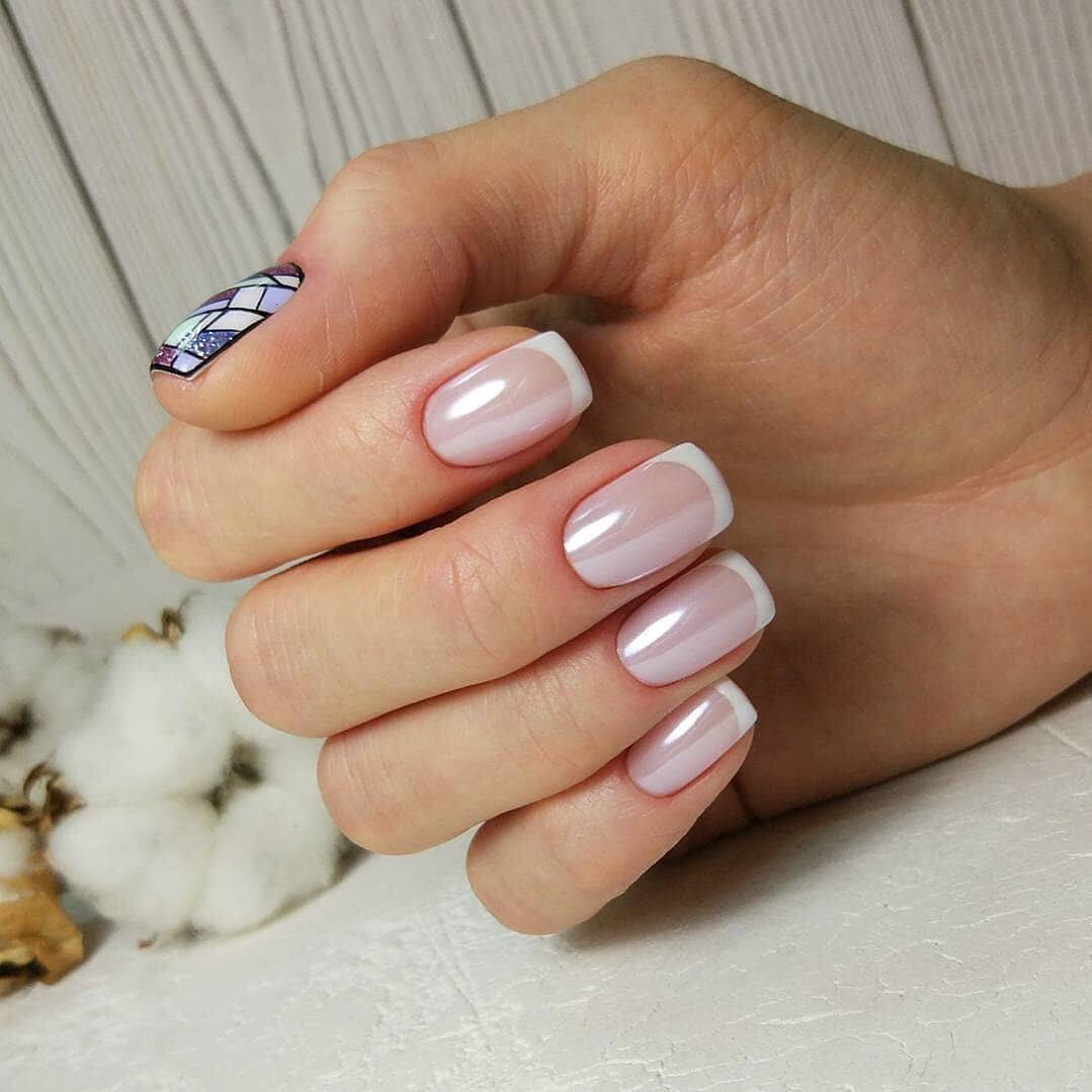 Классический французский маникюр с квадратной формой ногтя. Чтобы немного разнообразить его добавьте немного мерцания и блесток для ногтей. Этот маникюр использует белый блеск на кончиках, а также акцентированный ноготь на каждой руке.