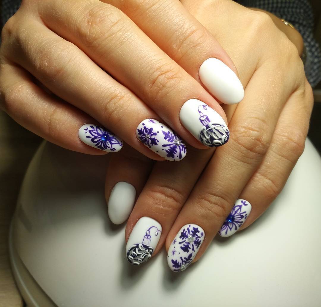 Очень эффектно будут смотреться белые кружевные вензеля, в сочетании с френчем или блестящим дизайном, на длинных острых ногтях.