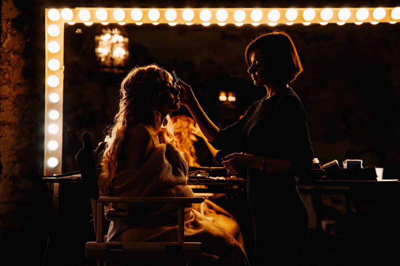 В зале есть своя гримерка с ламповым освещением, это удобно для визажиста, и дает возможность попутно сделать несколько необычных кадров.