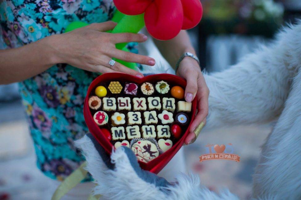 Через 10 минут после доставки десерта необходимо прибыть к возлюбленной с букетом и кольцом. Это идеальный вариант предложения для сладкоежки.