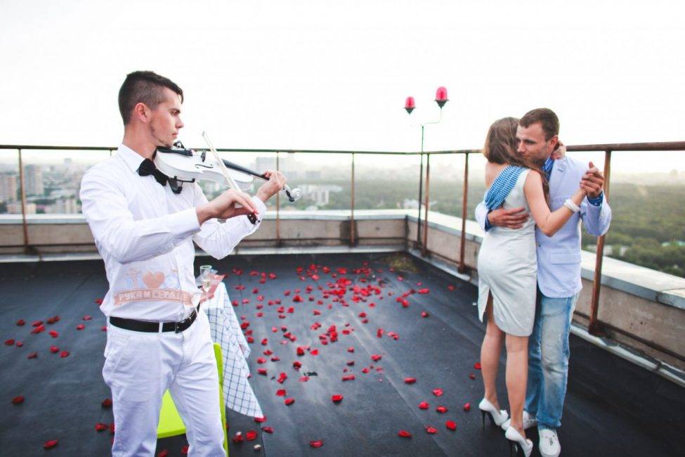 Ресторан на крыше Как показали исследования и соцопросы, именно такой вариант предложения руки и сердца пришелся по вкусу восьмидесяти процентам девушек. Если вы считаете, что огромный букет красных роз, фрукты, шампанское, скрипач и свечи — это скучно и заезжено, то девушки придерживаются другого мнения. Если вы не готовы рисковать, то выбирайте такой классический вариант. Особенно хорошо он подойдет для теплых летних ночей. Если у вас нет возможности организовать это все самостоятельно, обратитесь за помощью в агентство. Они с радостью профессионально организуют вам такой вечер, учитывая все ваши пожелания.