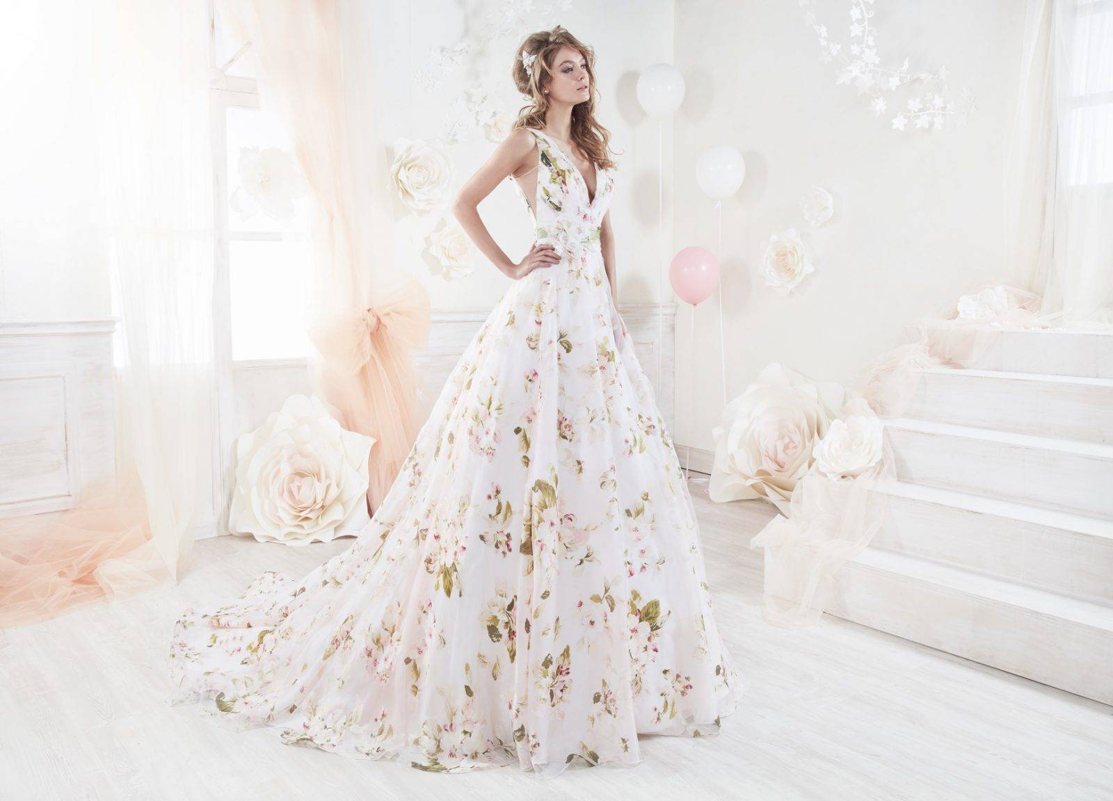 Можно использовать нежнейшие наряды с цветочными рисунками. Они встречаются практически во всех коллекциях знаменитых дизайнеров. Платье выглядит очень миловидно, с умеренной торжественностью. С таким принтом можно использовать фасоны в пол, для бракосочетаний они не будут выглядеть слишком нарядно, затмевая образ невесты.