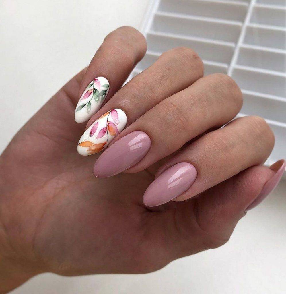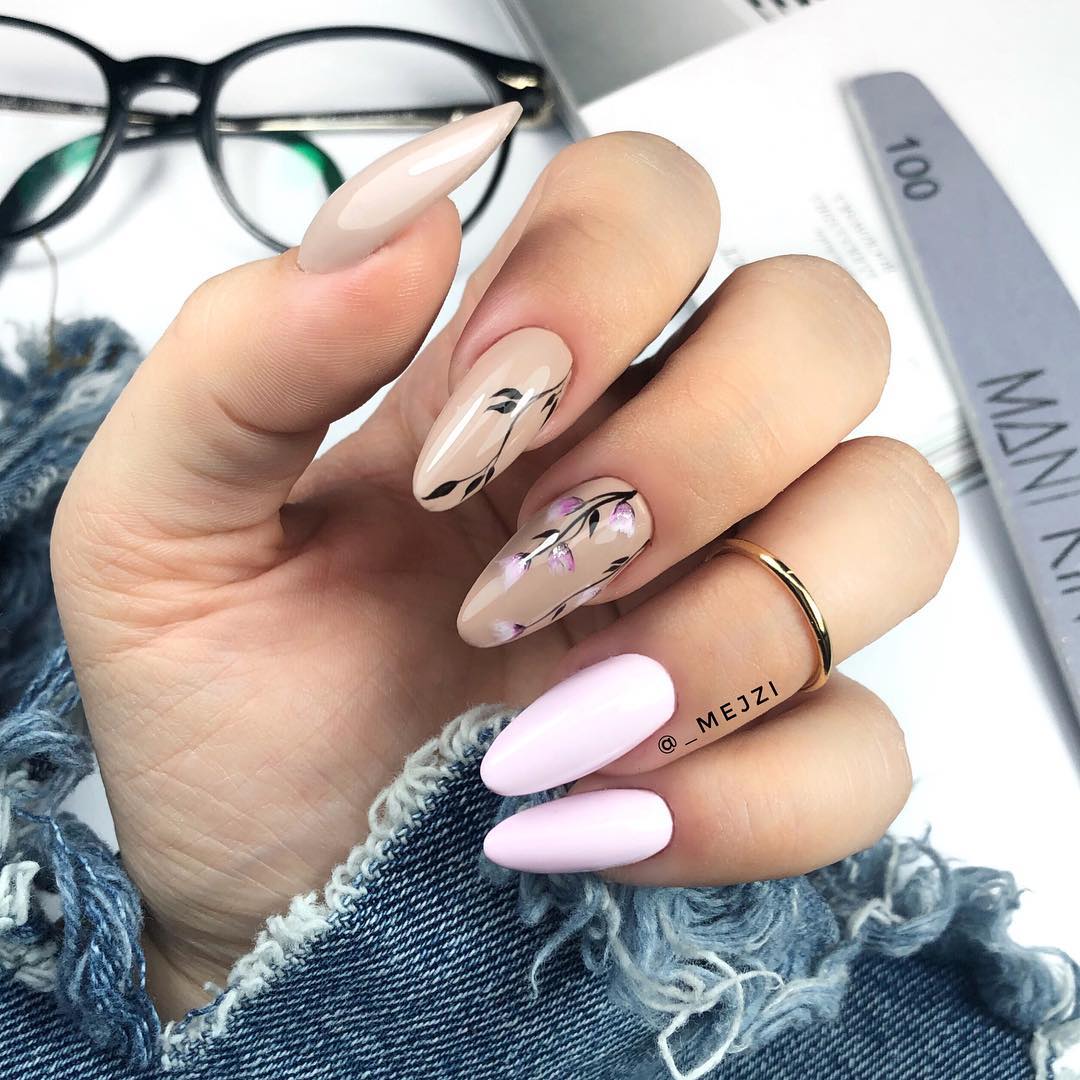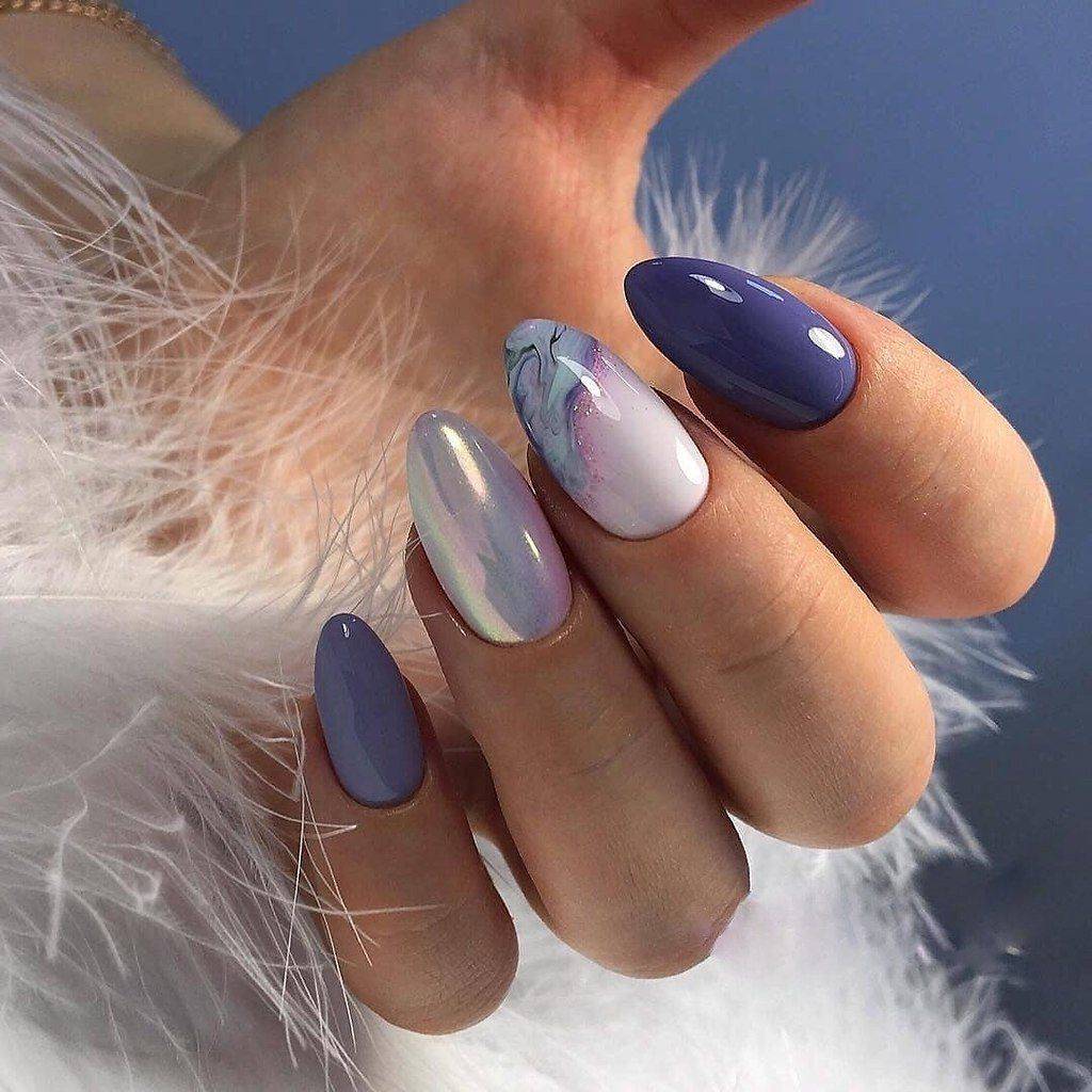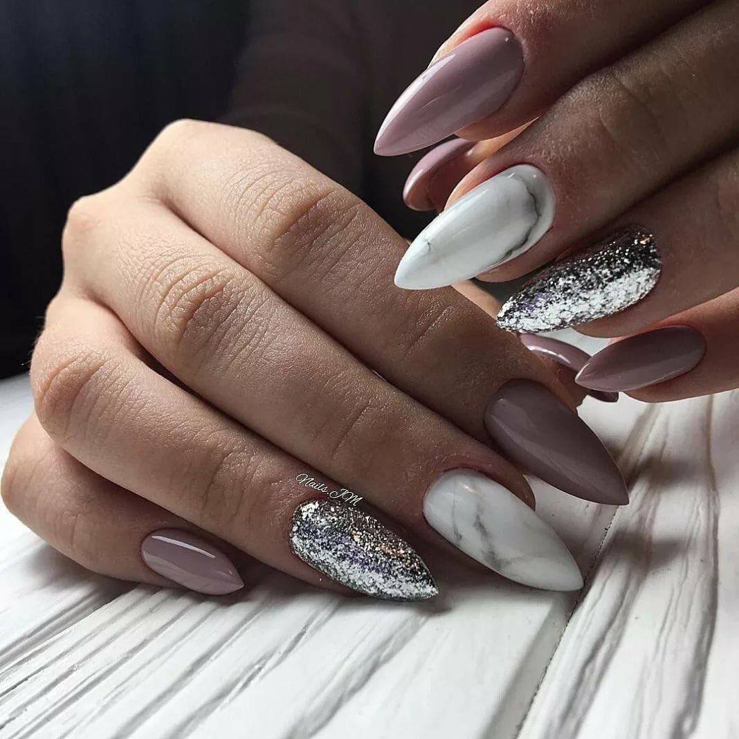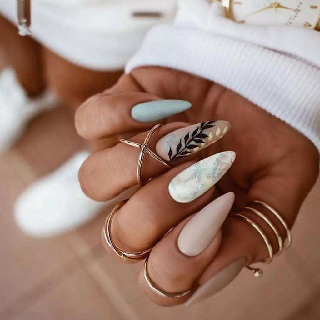 Модная находка — оформление всех ногтей по очереди более темными оттенками лака, использование молочного белого для указательного пальца и мизинца, совмещение разного дизайна, нескольких видов нейл-арта.