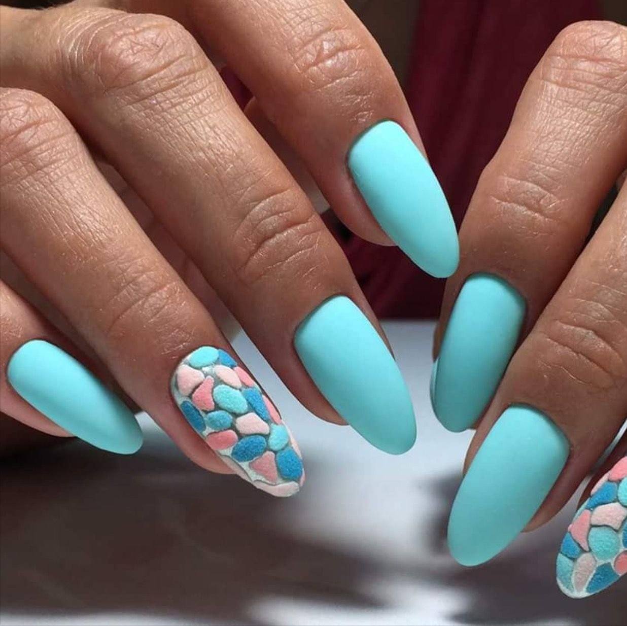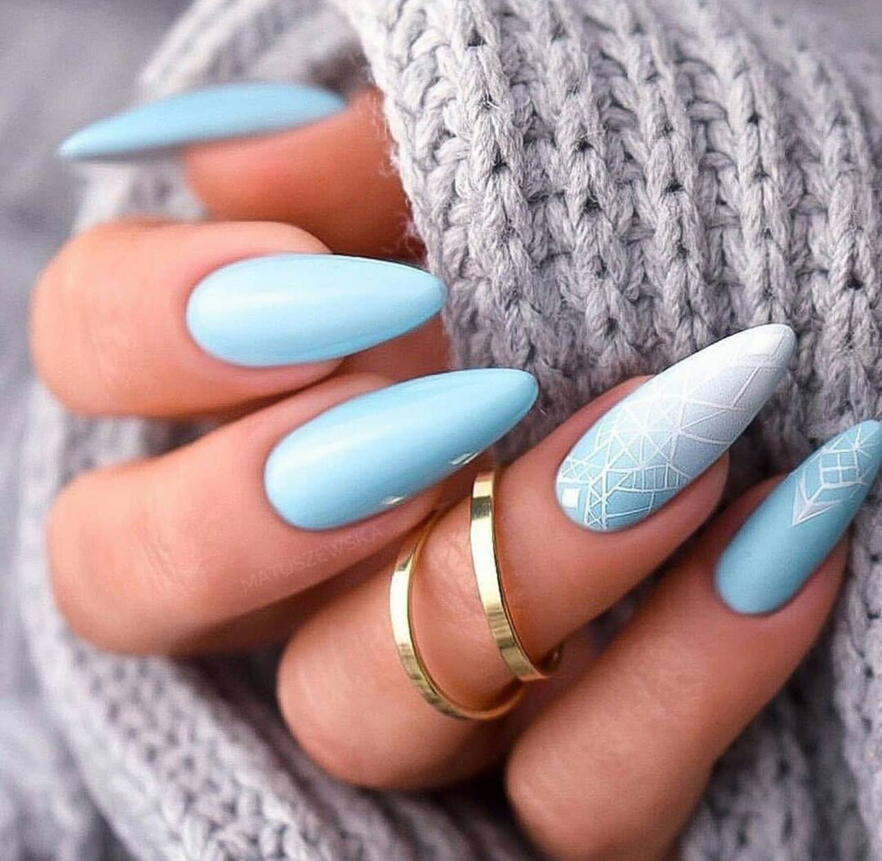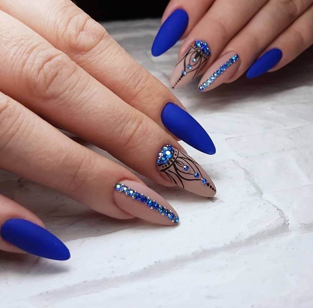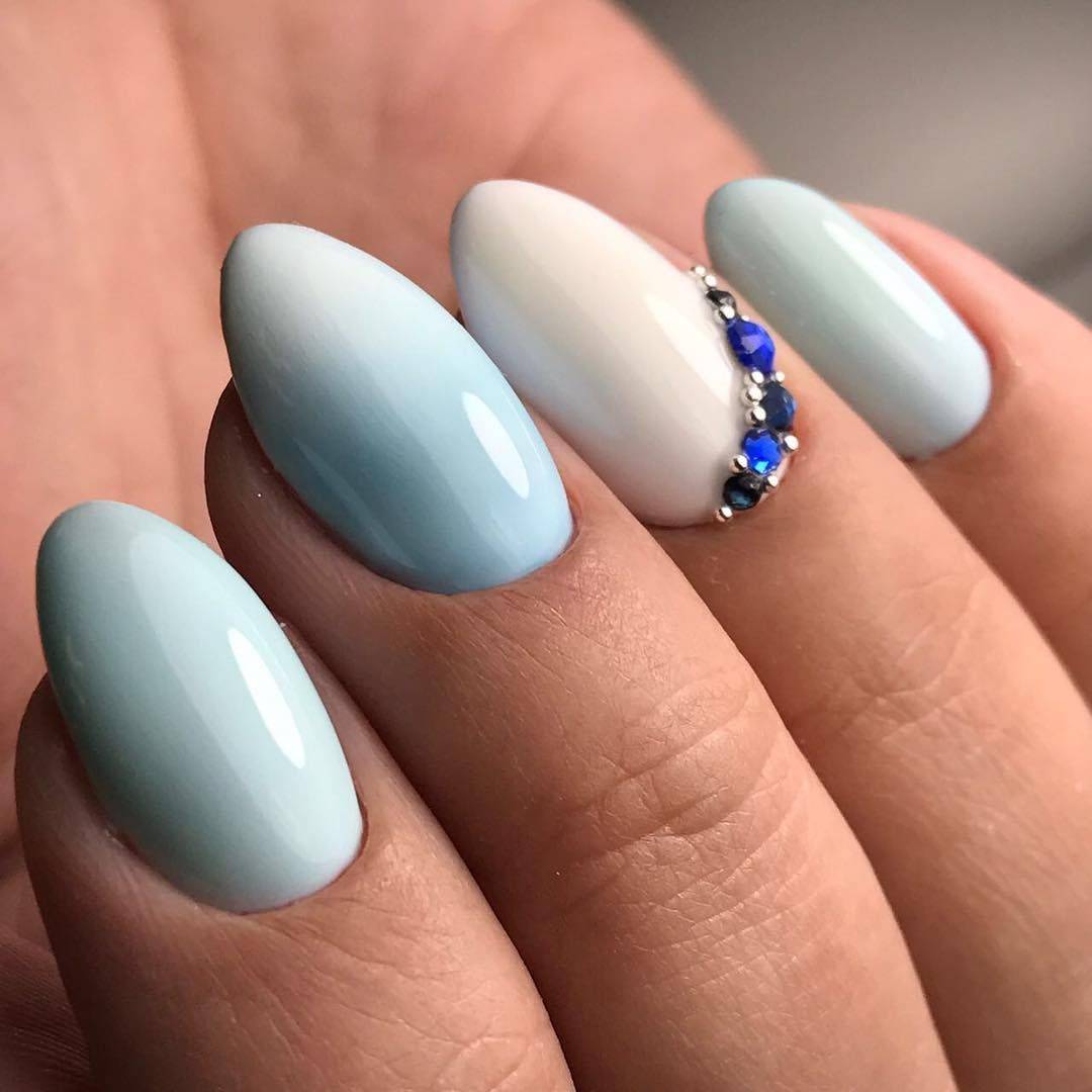 Голубой или синий маникюр для невесты. Как говорилось ранее, многие девушки уходят от стандартов и отдают предпочтение индивидуальности. Поэтому маникюр на свадьбу может быть выполнен в яркой цветовой гамме. Очень популярен в этом сезоне голубой и синий цвет. Эти оттенки можно смешать между собой или же использовать по отдельности, дополняя результат подходящими декоративными элементами.