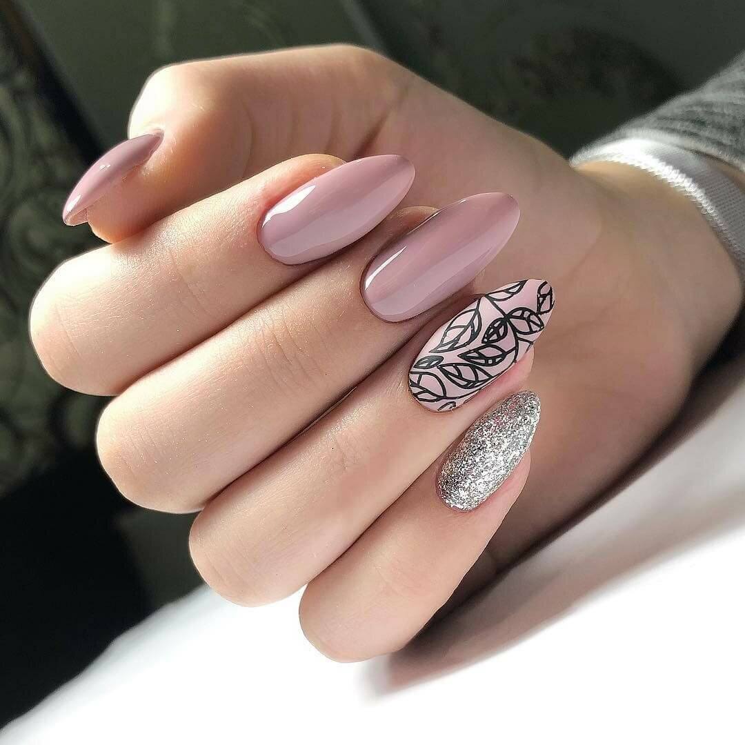 Наличие коротких ногтевых пластин совсем не означает отказ от нюдового маникюра с использованием блестящих частиц. Вы можете красиво украсить кончики ногтевых пластин глиттером или подчеркнуть природный оттенок основания кусочками блестящей фольги. Вертикальные блестящие полосы, помогут визуально вытянуть форму ногтей. Также очень привлекательно смотрятся выделенные блёстками лунки или аккуратные рисунки, расположенные на нескольких пальцах, например веточка с блестящими листиками украшает ногтевую пластину большого пальца, а одиночный, словно оторвавшийся и унесённый лёгким порывом ветра листик, на другом пальце.