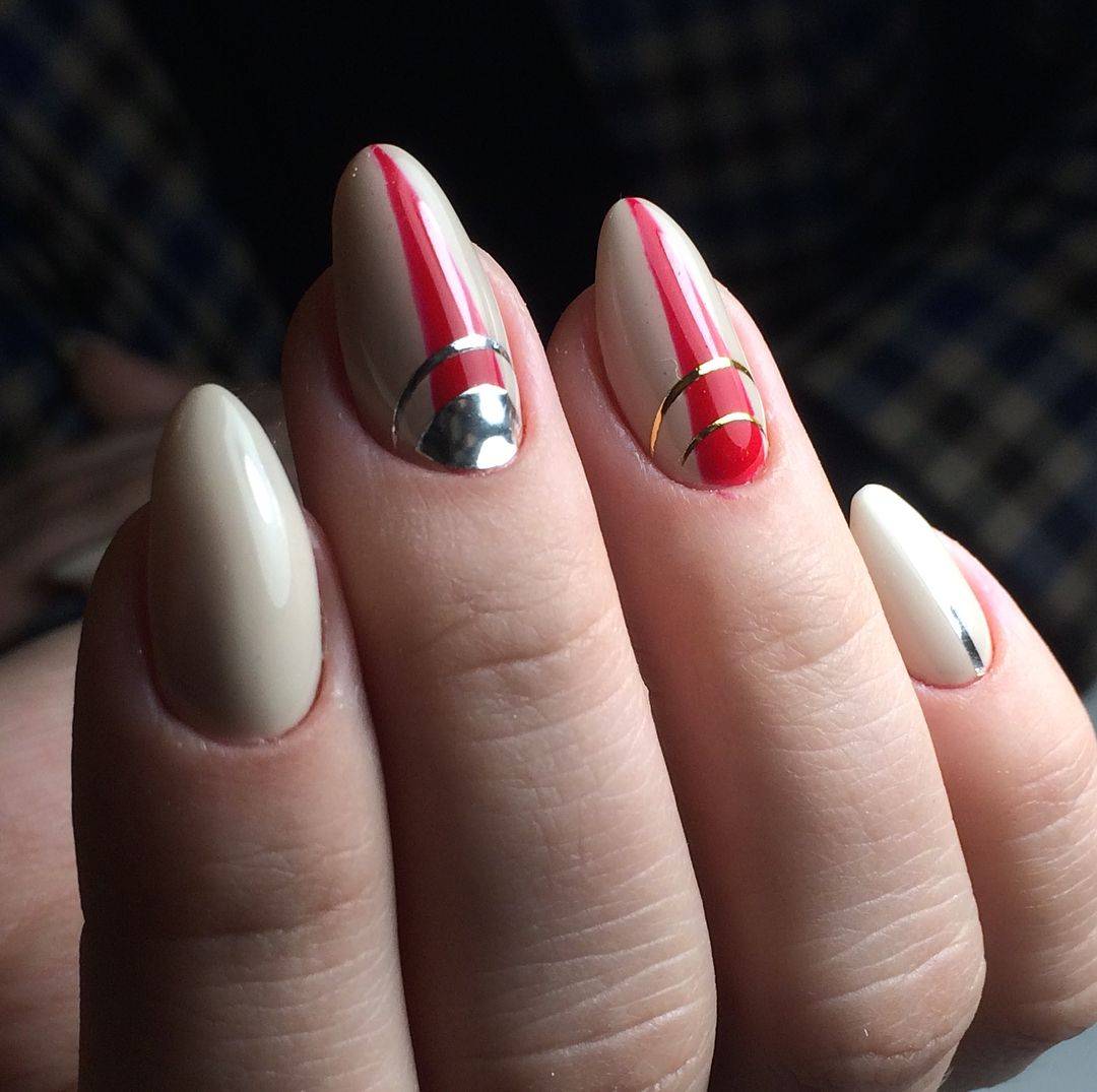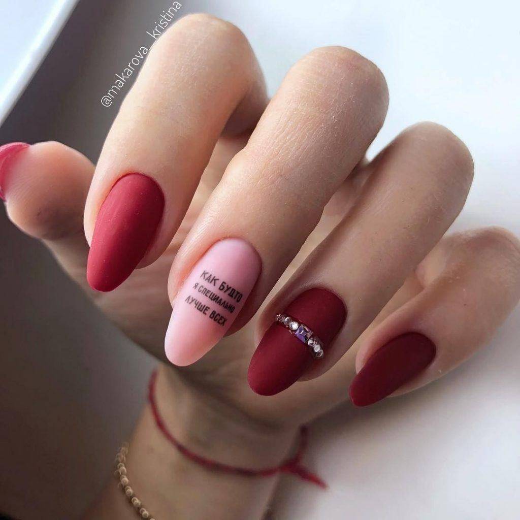 Также, очень стильно и нежно смотрятся красные ноготки в сочетании с несколькими молочными или нюдовыми ноготками, на которые нанесены надписи черного или красного цвета.
