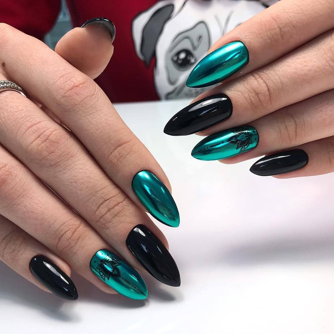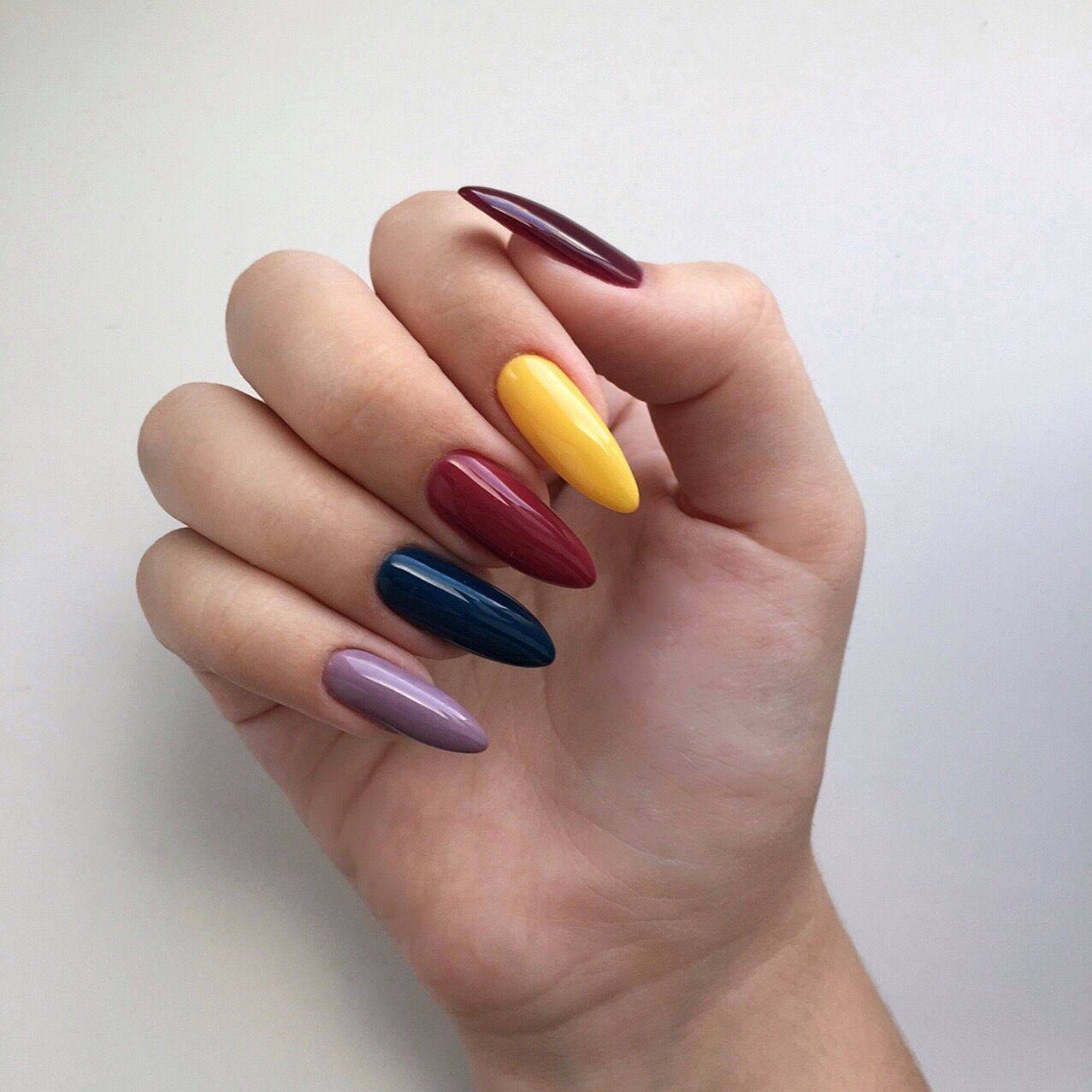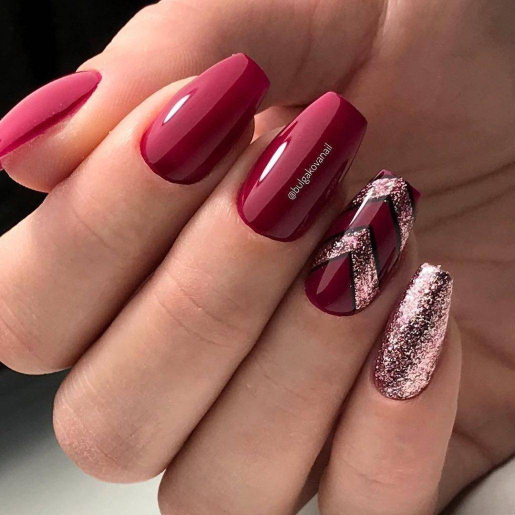 Глубокий тёмный маникюр подойдёт для вечерних выходов и промозглой погоды. Чтобы не переборщить с цветом, можно использовать однотон на всех пальцах в сочетании с матовым топом. Если же хотите получить шикарный результат для праздника, дополните благородные винные, коричневые, чёрные, зелёные оттенки серебром или золотом.