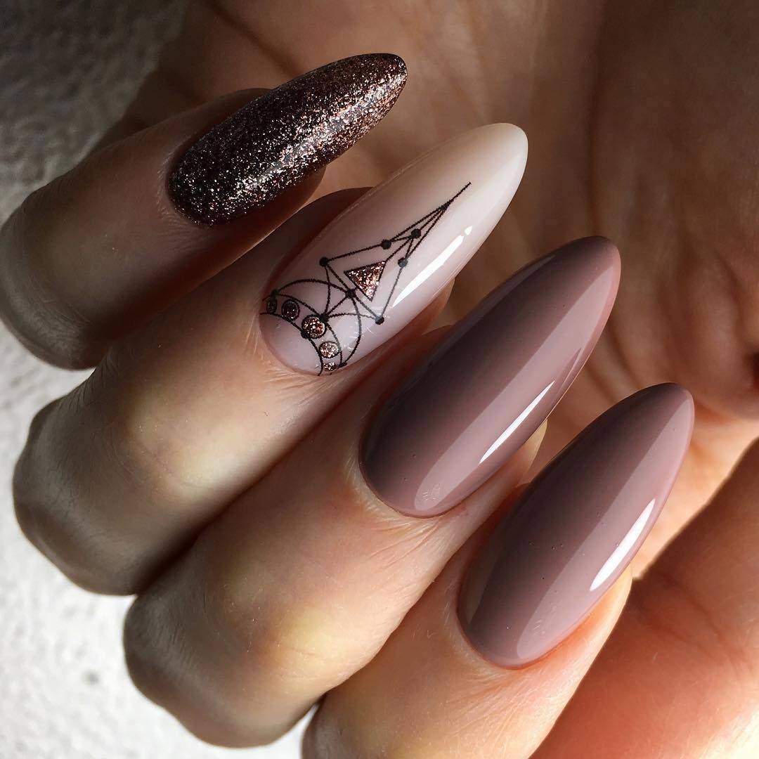 Не лишним в исполнении маникюра нюд будет использование фольги, акриловой пудры, всевозможных блесток, камней и страз, но используя эти украшения надо помнить, нюдовый маникюр – это естественность и натуральность. Здесь нельзя переусердствовать с украшениями. Самый оптимальный вариант в нюдовом маникюре – минимализм. Минимализм всегда в моде. Дополнив минимальным количеством украшений свои ногти, вы получите неповторимый, модный, привлекательный маникюр. В качестве рисунка может выступать геометрический рисунок, выполненный тонкими линиями или просто тонкая линия по середине ногтя, а может нежный утонченный цветок или листик. Актуальны в 20189 году небольшие точки или хаотичные мазки. Замечательно будет смотреться небольшие вкрапления из блесток, фольги или блестящей скотч-ленты, но нужно быть с этим очень аккуратно, т.к. минимализм подразумевает – мало.