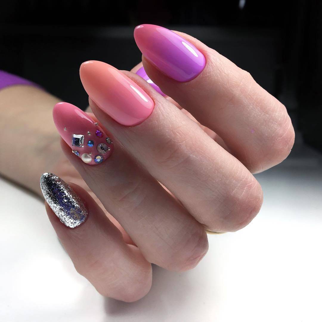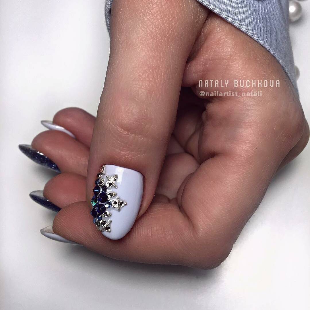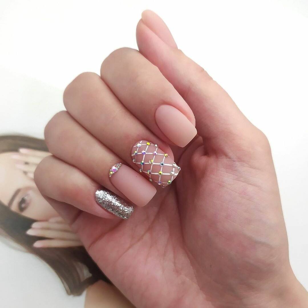 Также мы рекомендуем обратить внимание на классический френч с блестящими кристаллами либо лунный дизайн с декорированной или прозрачной улыбкой. В списке более ярких идей оформления можно отметить маникюр с фольгой и «паутинкой», в котором стразы располагаются в хаотичном порядке поверх гелиевых узоров, ноготки нюд со стразами и втиркой, геометрический нейл дизайн и многие другие предложения