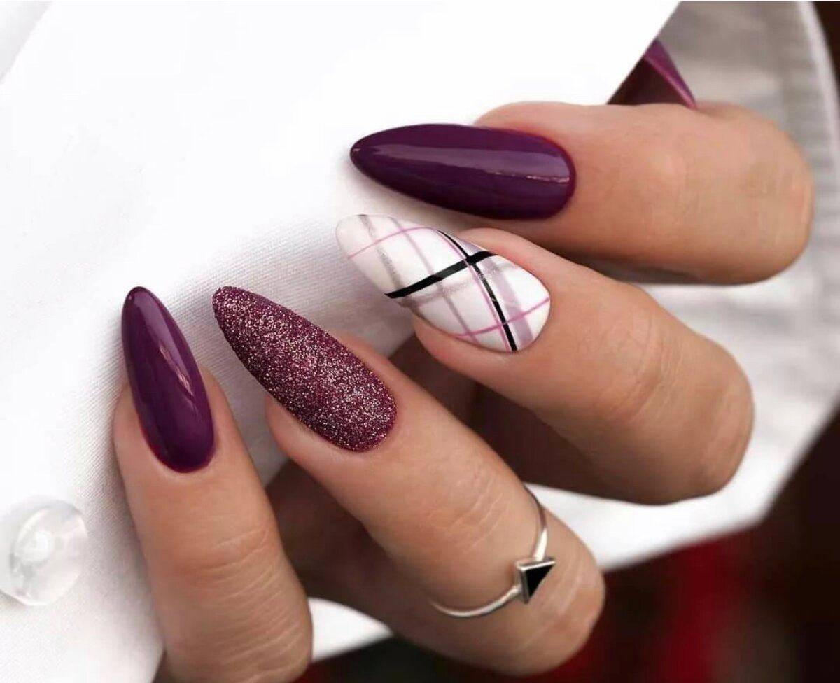 Модный нынче цвет спелой вишни или пьянящего вина, именуемый марсала — зимний вариант контрастного маникюра для уверенных в себе красавиц.