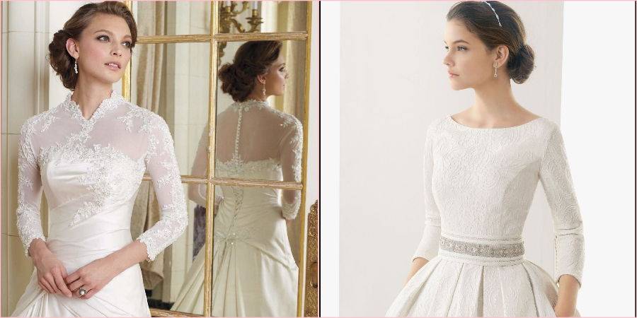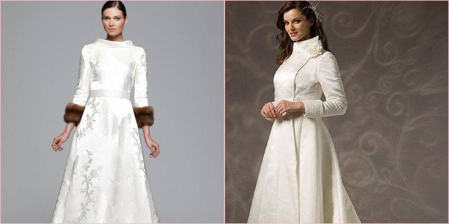 Среди материалов лучше выбирать плотные ткани, например, атлас или натуральный шёлк. Такие модели не позволят невесте замёрзнуть и будут хорошо держать форму. А длинный рукав скроет «мурашки» на коже от холода.
