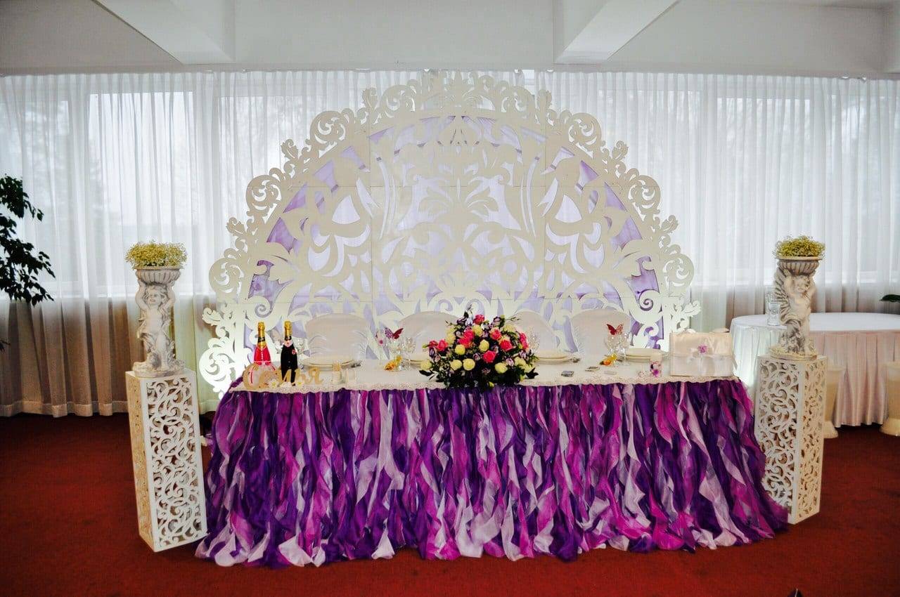 - Лучше всего расположить стол для новобрачных в центре зала, на возвышении или в другой выгодной точке – все присутствующие должны со своих мест видеть молодых;