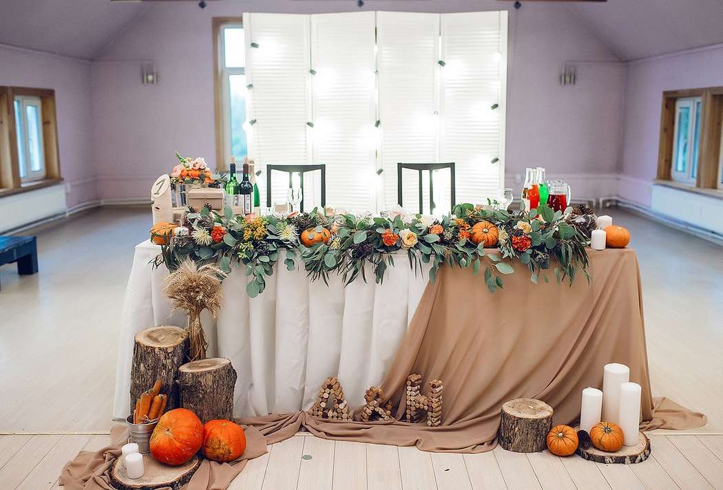 Оригинальный декор осеннего стола молодоженов своими руками можно сделать с помощью тыквы. Для этого нужно аккуратно срезать верхушку, выбрать ложкой и ножом все содержимое и подсушить готовую «вазу». Чтобы цветы не засохли быстро, на дно можно положить мокрую мочалку. Идеально в таком варианте будут выглядеть ирисы, подсолнухи, астры, хризантемы. Можно превратить такую композицию и в «осеннюю фантазию», для этого внутрь поставить колосья, разбавив их ветками с гроздьями калины.