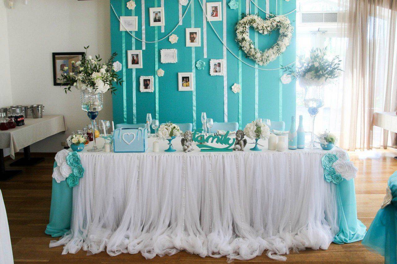 Оформление зала должно соответствовать общей концепции – если предполагается свадьба в бело-бирюзовых тонах, значит, убранство зала должно исполняться в них же.
