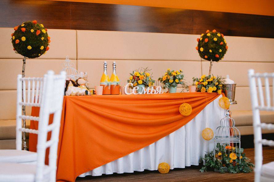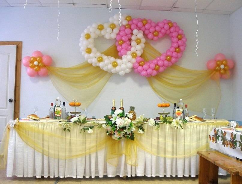 Если молодые предпочитают более сдержанный стиль, на столе можно оставить минимум необходимого, зато оформить красиво задник. Или даже сочетать несколько предложенных вариантов.