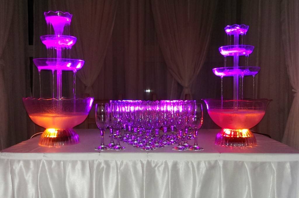 Винный фонтан. Красивое, но довольно дорогое украшение стола. Оно используется как дополнение и обычно делается на заказ. Это небольшой фонтан из стекла, в котором льется напиток. Его можно наливать в специальные кружки, которые крепятся к этому фонтану.