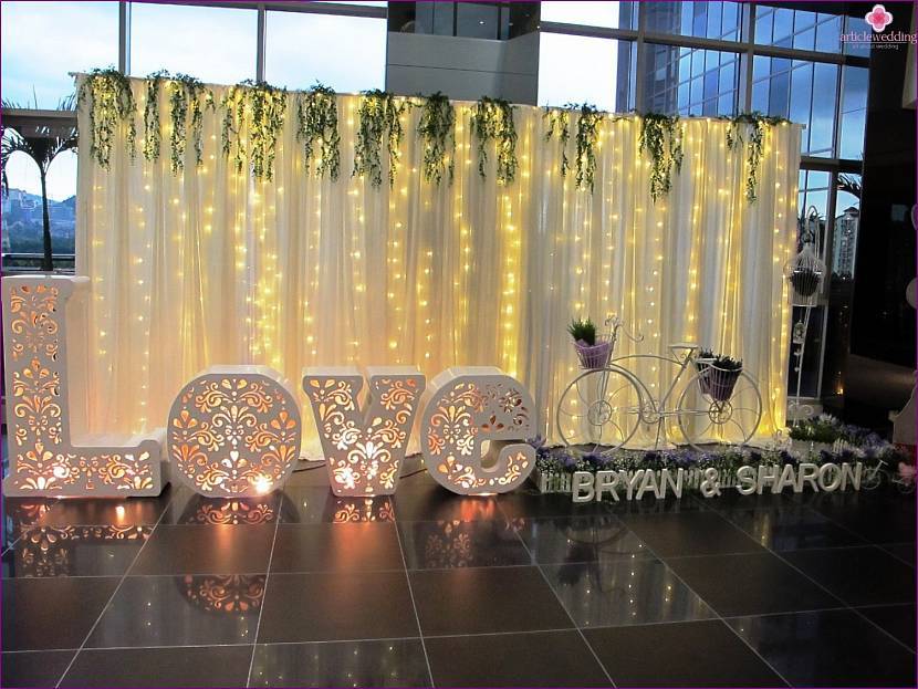 Отличная идея, которая подойдет для фотосессии свадеб в стиле прованс, европейский. Для создания понадобится искусственная перегородка на каркасе, большое белое тканевое или бумажное полотно. На него набрасывают гирлянду с крупными лампочками, закрепляют венок с искусственной флористики. Дополнением может послужить стихотворение-пожелание.