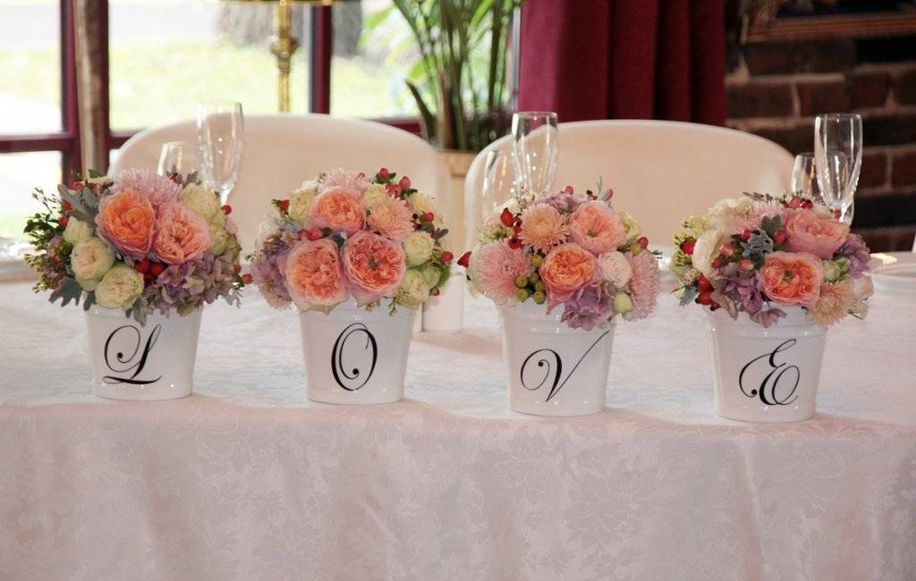 Композиция из цветов станет завершающим штрихом при оформлении помещения. Растения желательно подбирать под декор свадебного стола. Букеты не должны быть слишком громоздкими, иначе они будут мешать общению гостей.