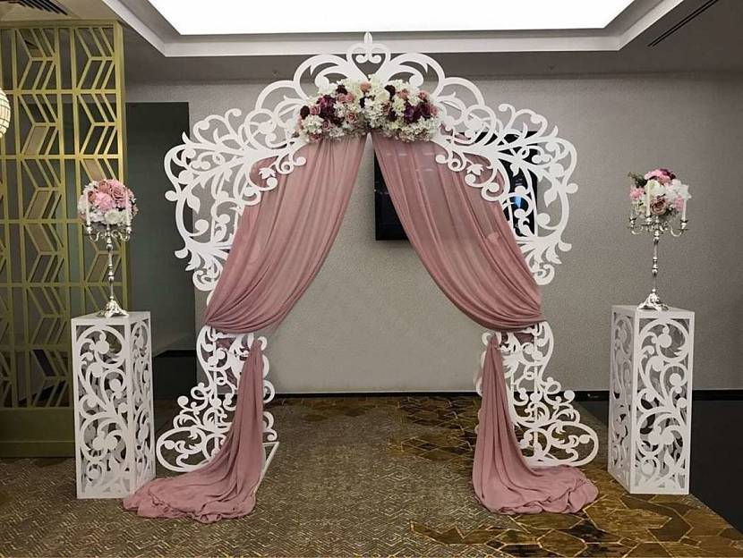 Свадебное оформление — это необязательно флористические мотивы. Можно создать арку с вензелями и рядом стоящими легкими тумбочками. К ним дополнительно закрепляются искусственные цветы, полупрозрачный текстиль: вуаль, шифон, органза. Красивая узорная конструкция также может сыграть роль алтаря для выездной церемонии.