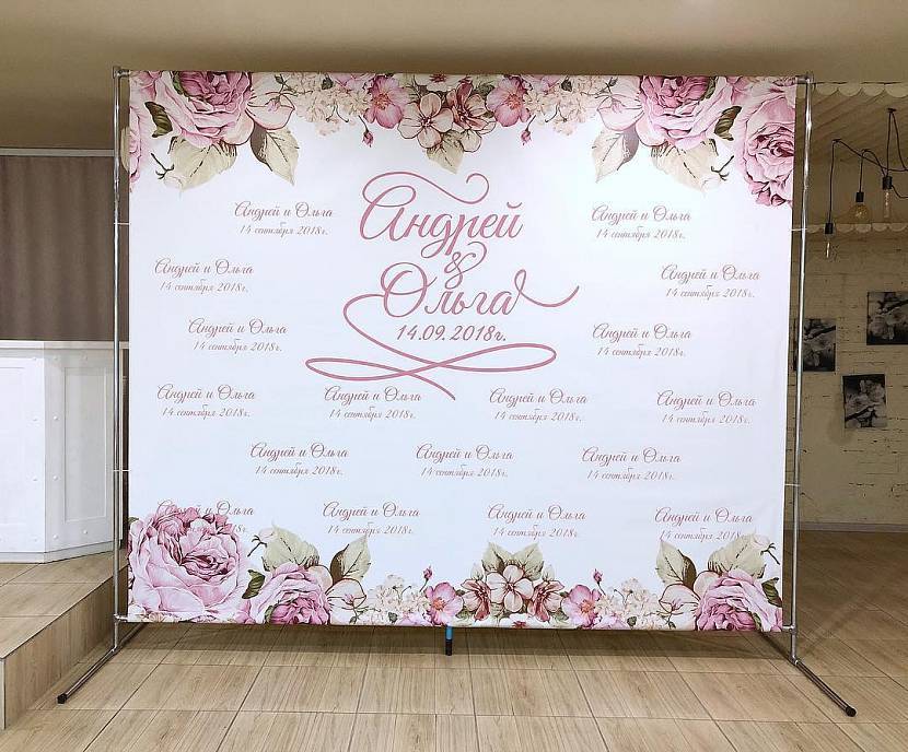 Такой можно заказать в типографии и прикрепить его на металлический каркас. Чтобы зона для фотосессии выглядела более празднично и стильно, ее дополняют белоснежными тумбами. На них сверху ставят фигурные вазоны с букетами цветов. Верхнюю часть стенки можно дополнительно оформить светодиодной подсветкой. Это красиво смотрится на ночных фотоснимках.
