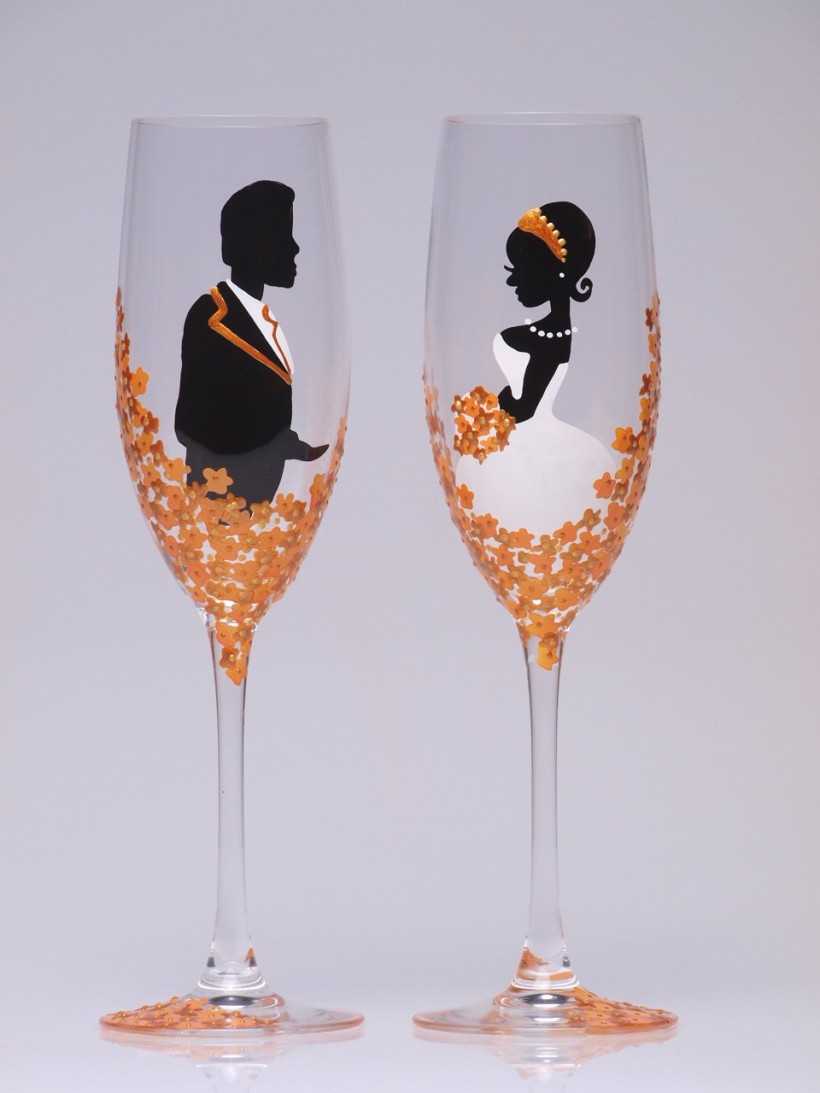 Есть еще один метод украшения бокалов — расписывание краской. Идеи могут быть разнообразные. На чашке можно изобразить жениха и невесту, цветы или обручальные кольца.