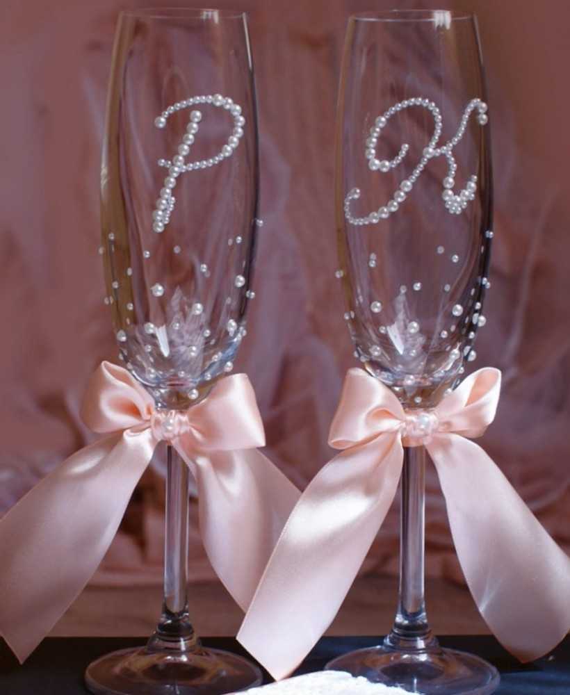 Цветные ленты, стразы и блестки, жемчуг — это лишь малая часть для оформления бокалов. Можно даже заказать фотографии жениха и невесты, оклеив ими бокалы.