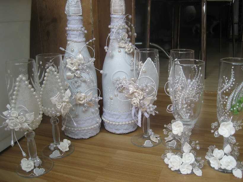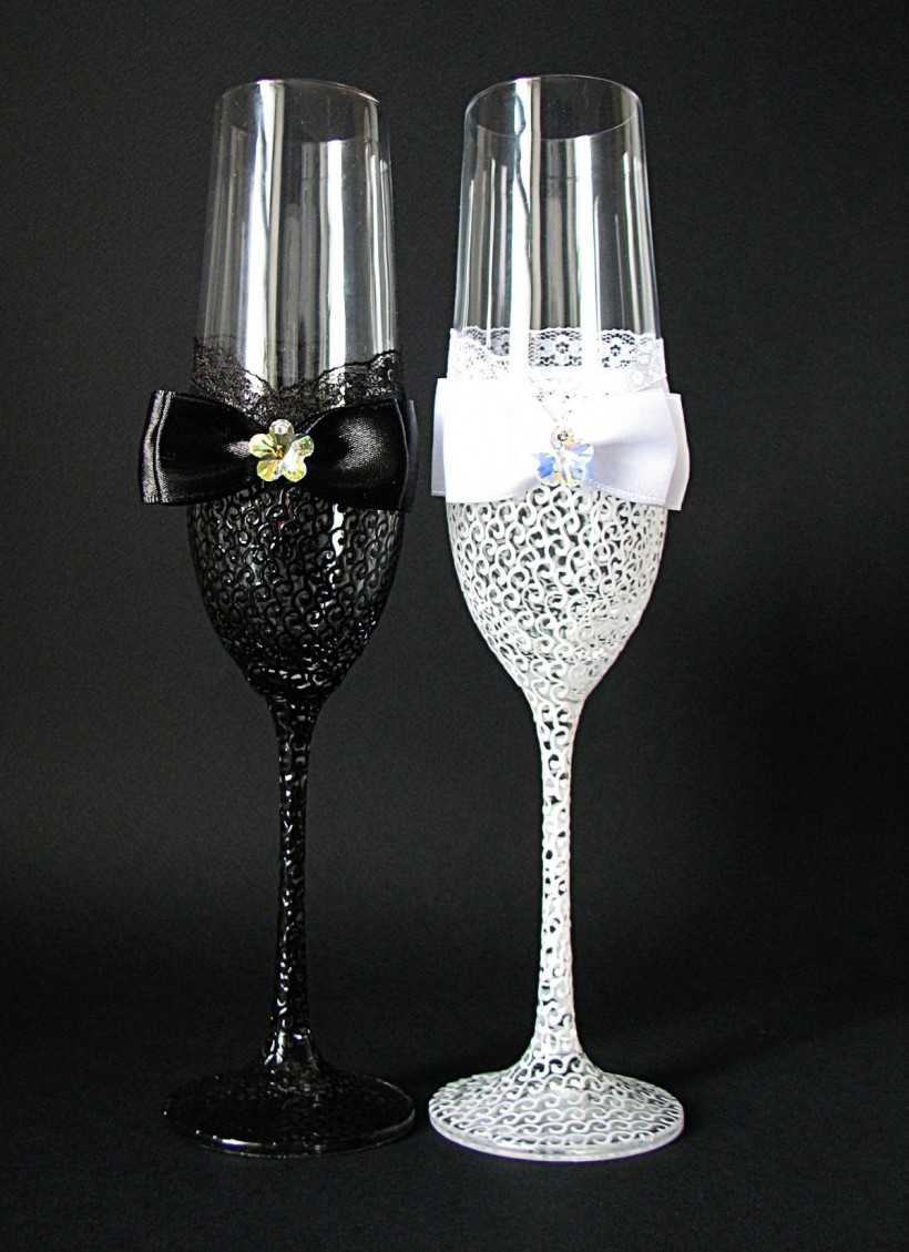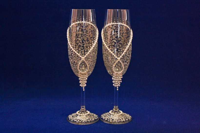 Основой свадебной атрибутики являются бокалы для новобрачных. В большинстве случаев их украшают дизайнеры так, чтобы они сочетались с нарядами жениха и невесты, а также украшенных залом. Но если этот вариант для молодых кажется дорогим, то можно украсить бокалы самостоятельно.