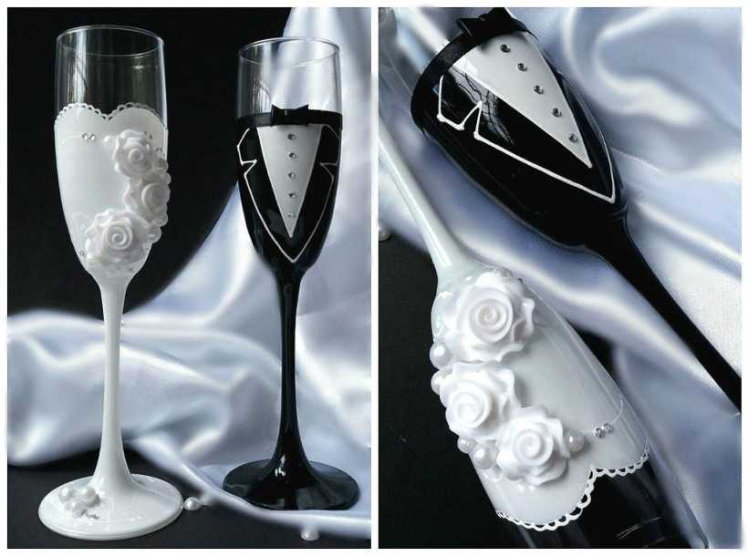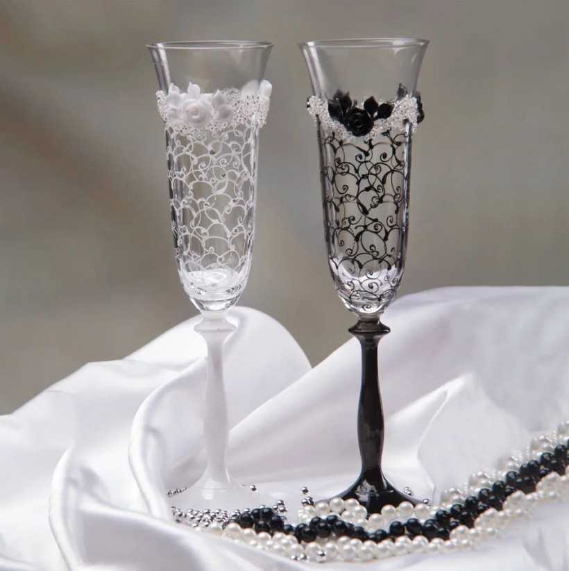 К украшению бокалов для молодоженов стоит подойти также креативно. Из этих бокалов молодые будут пить на свадьбу и после доставать их на годовщину или на памятные даты. По традиции свадебные бокалы связывали лентами, как знак физического и духовного единства жениха и невесты. Сейчас такой вариант изживает себя, на замену приходит оригинальное украшение при помощи страз, кружева, лент, цветов из холодного фарфора или полимерной глины. Украсить бокалы при помощи страз легко и быстро. В качестве инструментов понадобится клей и собственно – стразы. Придумайте узор, дизайн и приступайте к декорированию. Яркие примеры такого оформления можете посмотреть на представленных фото.Дешевым, но не менее оригинальным вариантом оформления являются атласные ленты и кружева. Здесь все зависит от вашей фантазии. Но не забывайте, бокалы должны соответствовать стилю свадьбы и максимально отвечать основным цветам и тематике.Оформление бокалов при помощи цветов из фарфора смотрятся эффектно, но сделать это не просто. Работать с фарфором нужно придерживаясь определенных инструкций.