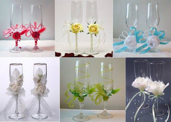 Цветные ленты, стразы и блестки, жемчуг — это лишь малая часть для оформления бокалов. Можно даже заказать фотографии жениха и невесты, оклеив ими бокалы.
