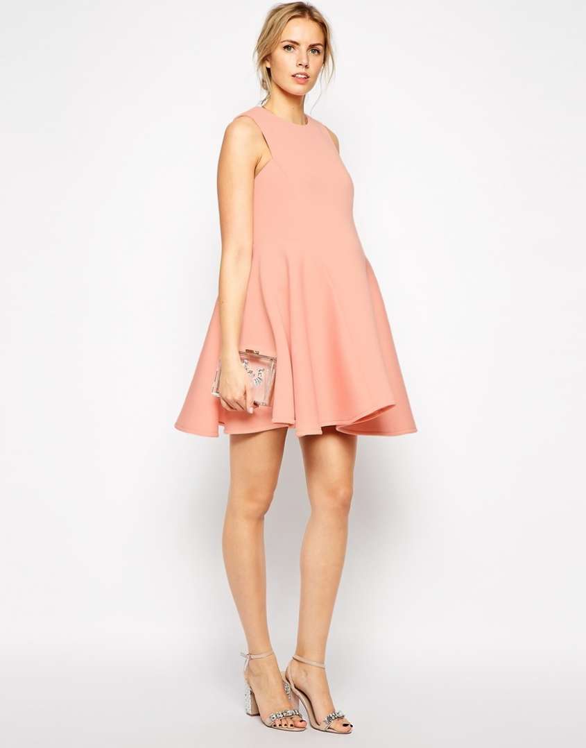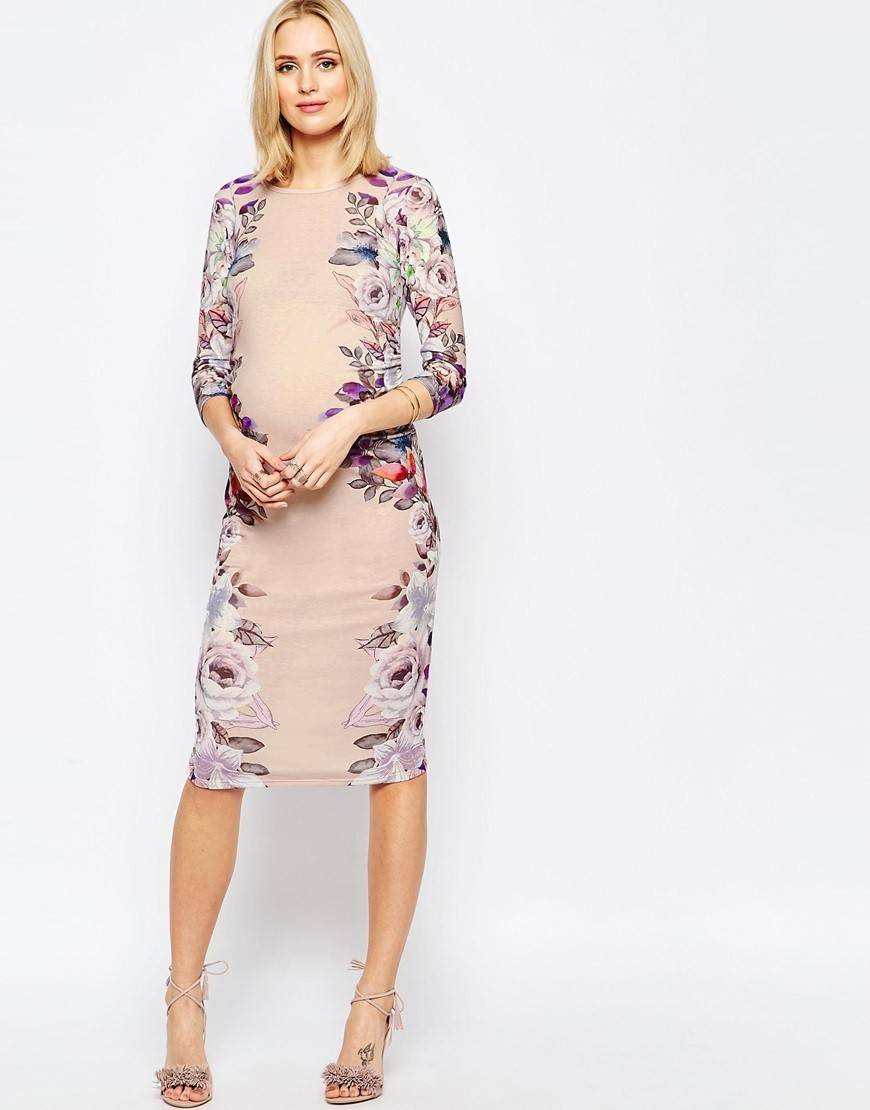 Выбор модели платья во многом зависит от срока беременности. Если срок небольшой – 5 или 6 месяцев, подойдет обычное трикотажное платье-футляр, которое легко растянется до нужного объема в области живота.