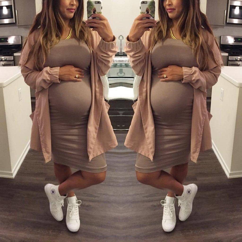 Некоторые предпочитают обтягивающие модели при беременности. Но для того чтобы не выглядеть вульгарно, лучше выбирать приглушенные тона и длину ниже колена.