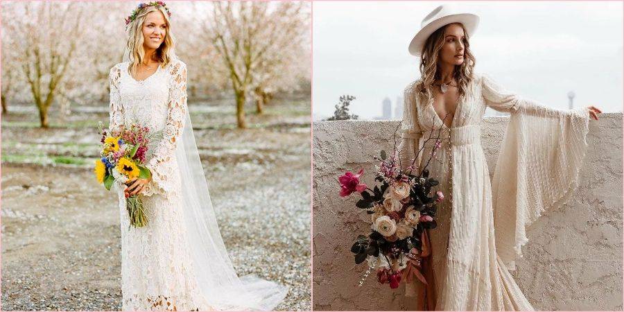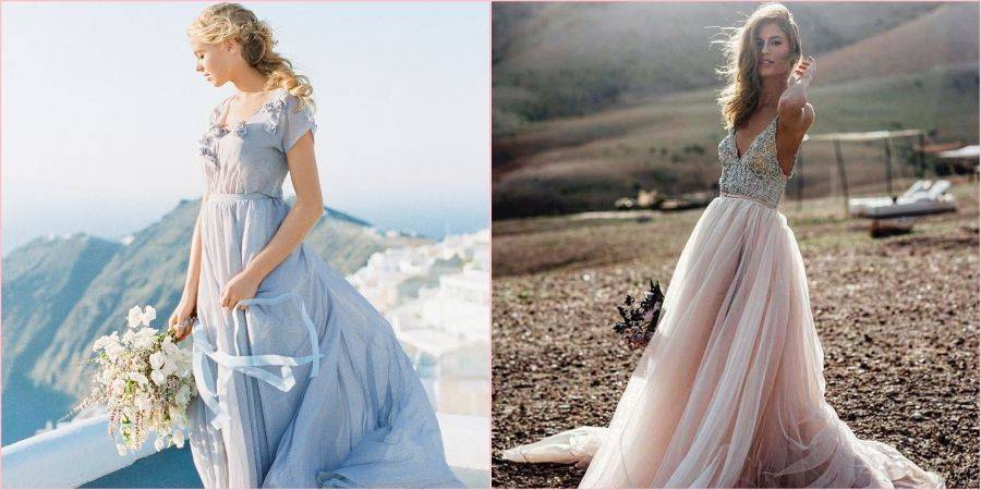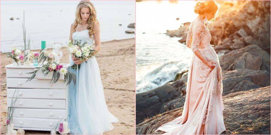 Платья в пол могут быть ровной длины или со шлейфом, вышитым кружевом. Выбор зависит от предпочтений невесты, длительности торжества и погоды. В дождливые дни от шлейфа следует отказаться или применить платье-трансформер с отстегивающейся частью юбки.