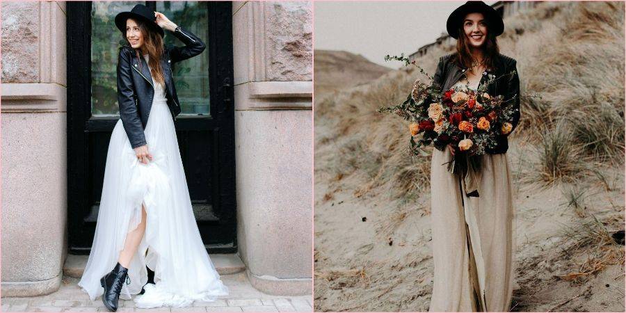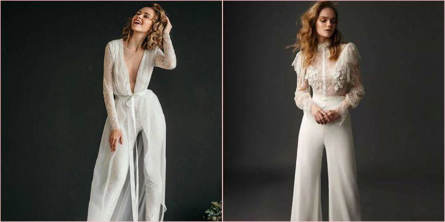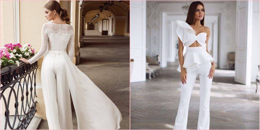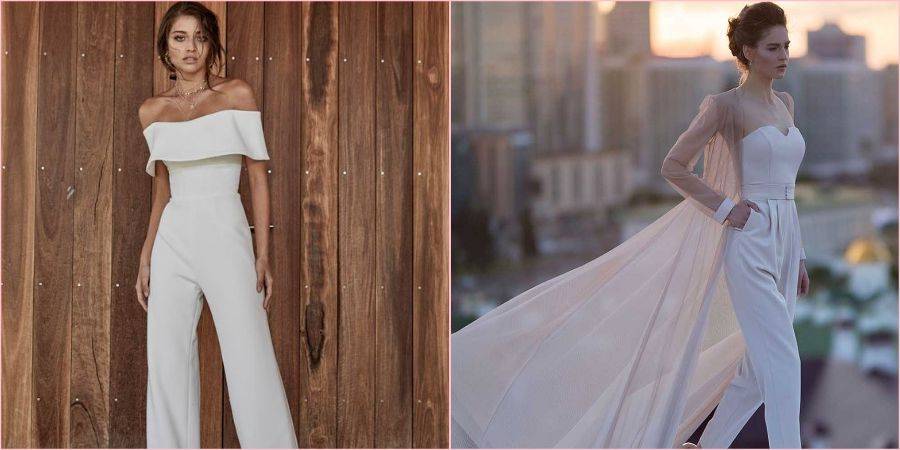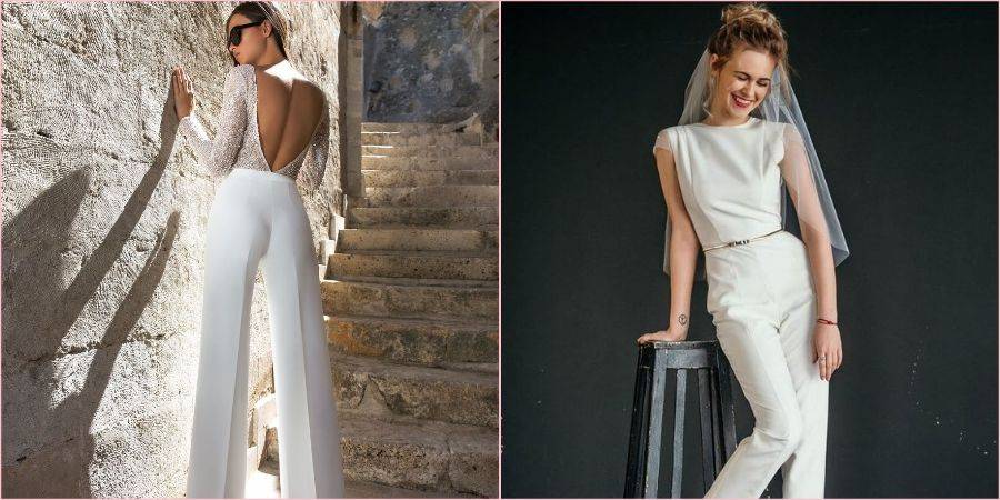 Еще пару лет назад сложно было представить невесту в брюках и уж тем более в комбинезоне, теперь же такой вариант стал стильной реальностью. Модельеры давно уже разрушили стереотип, что женщина на празднике должна быть обязательно в платье или юбке, позже это коснулось и новобрачных, если Вы любите штаны, чувствуете себя в них удобно и комфортно, то брючный костюм или комбинезон Ваш выбор. Подробнее о них, читайте в нашей отдельной статье на эту тему.