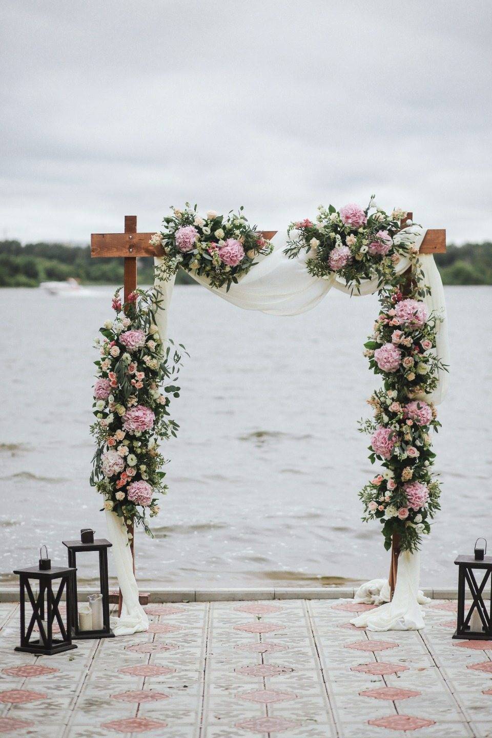 - флористические композиции вдоль прохода к алтарю и/или возле арки (в цветочном декоре свадьбы следует использовать в качестве основных соцветия пудрового оттенка, дополнив их пастельными или более темными цветочками, например, бордовыми или фиолетовыми, а также зеленью).