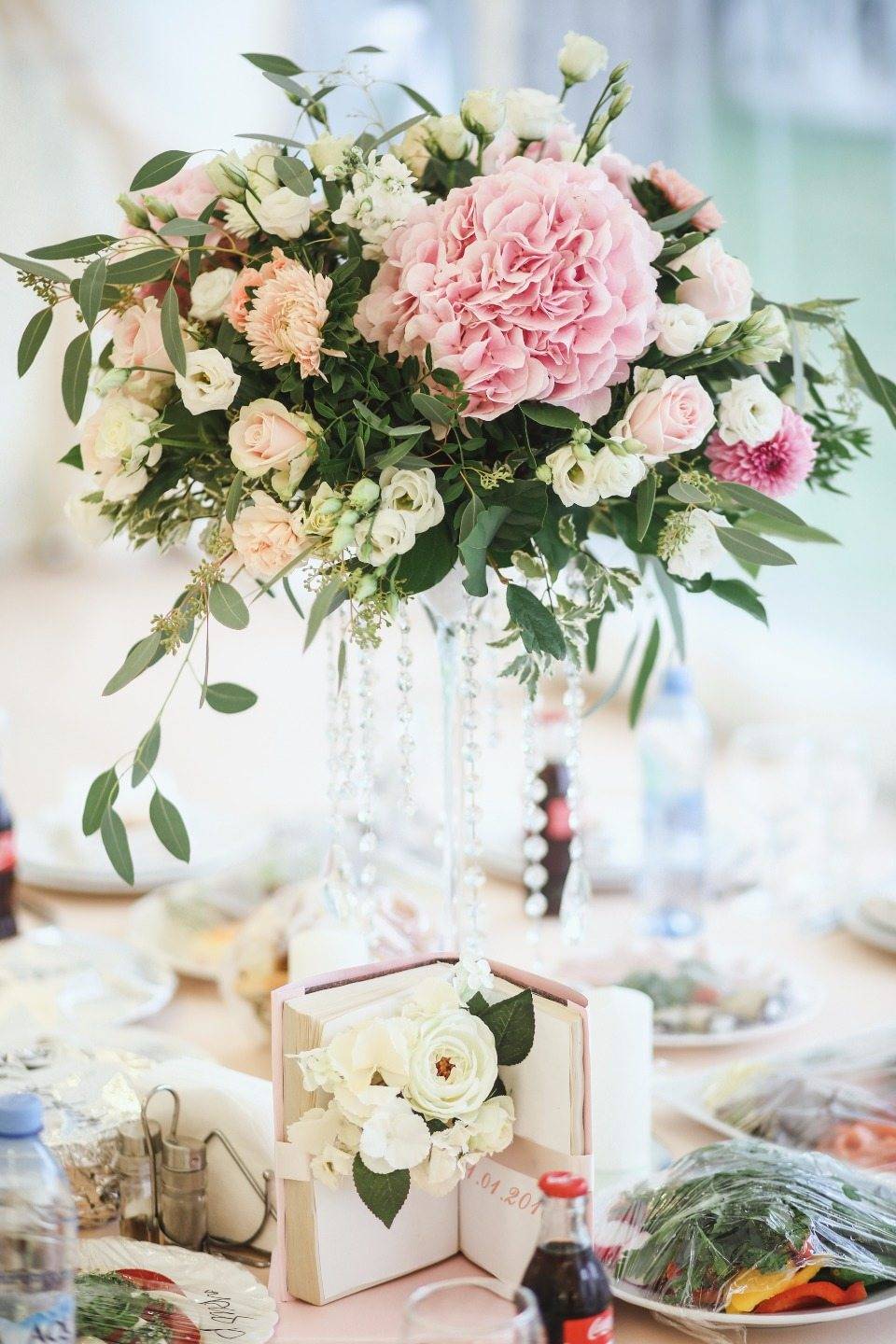 - флористические композиции на столах, у входа в зал и возле важных локаций, например, оригинальной идеей станет цветочный стенд за столом молодоженов.