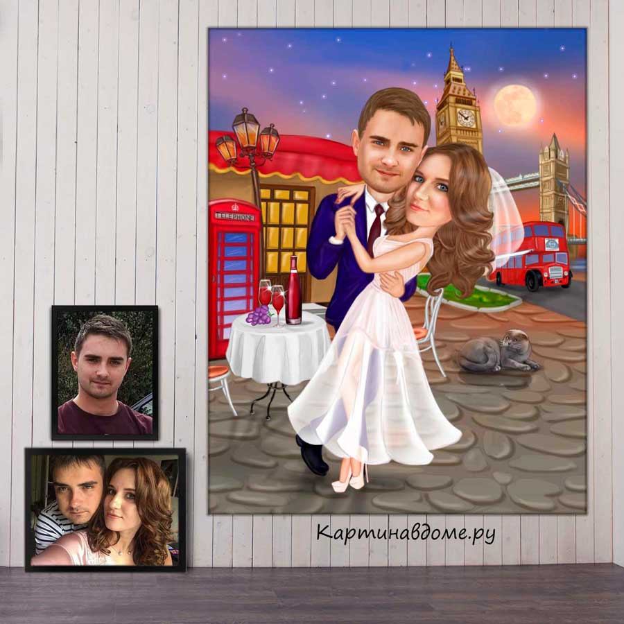 В таком подарке вас ограничивает лишь только фантазия и можно придумать что угодно! Молодоженов можно изобразить на яхте (или паруснике), на необитаемом острове, летящими на парашюте, танцующими прямо рядом с Эйфелевой башней во Франции или у кремля на Красной площади, катающимися на самокатах, или сидящих дома у камина со своим любимыми питомцами.