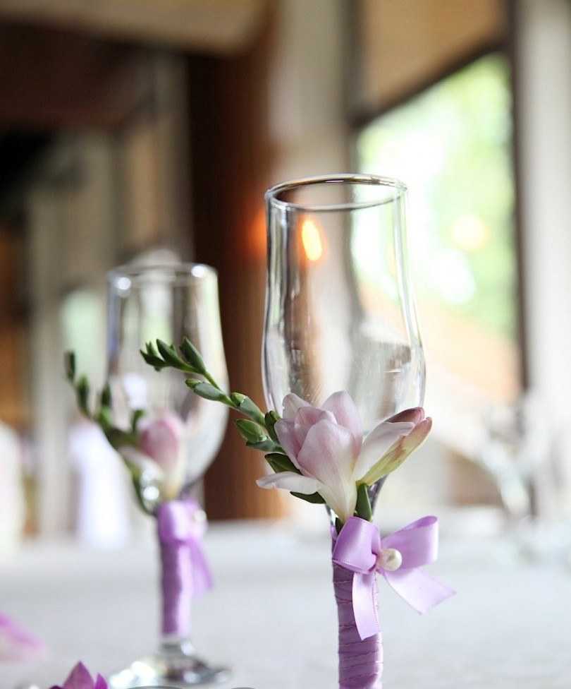 - Приклеить ленту или кружево. Можно располагать их как на ножке бокала, так и в средней части в зависимости от личных предпочтений;