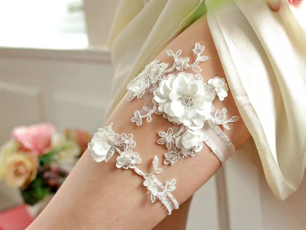 Если красный аксессуар символизирует любовь, а голубой предвещает рождение первенца-мальчика, то белый цвет подвязки невесты олицетворяет чистоту. Для создания вещицы, являющейся одним из символов новой семьи, хватает резинки, которая может быть узкой или широкой, и небольшого отреза ажурного кружева. Наилучшим дополнением к аксессуару являются украшения золотистого или серебристого цвета, символизирующие материальный достаток в доме. Не стоит приобретать изделия, в которых использована леска и другие жесткие материалы, которые могут доставить девушке дискомфорт.