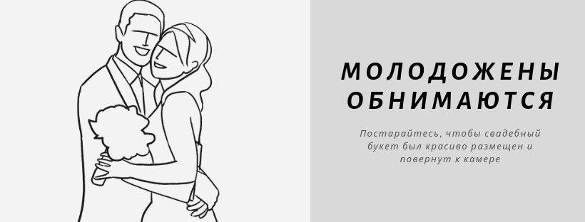 Очень простая поза. Молодожены обнимаются, прикоснувшись щеками. Постарайтесь, чтобы свадебный букет был размещен красиво и повернут к камере.