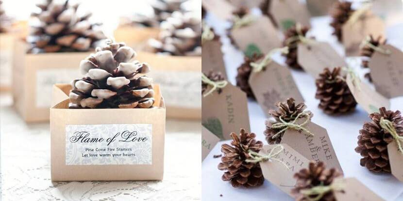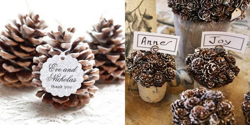 Шишки, красиво упакованные в бумагу или фатин станут необычным подарком для гостей торжества. Еще с давних времен существовали на свадьбах такие сувенирчики которые преподносились приглашенным. Также внешне можно украсить шишки различными украшениями, бисером, бусинами или даже покрасить в цвет свадьбы. Особенно подходят еловые небольшие шишки.