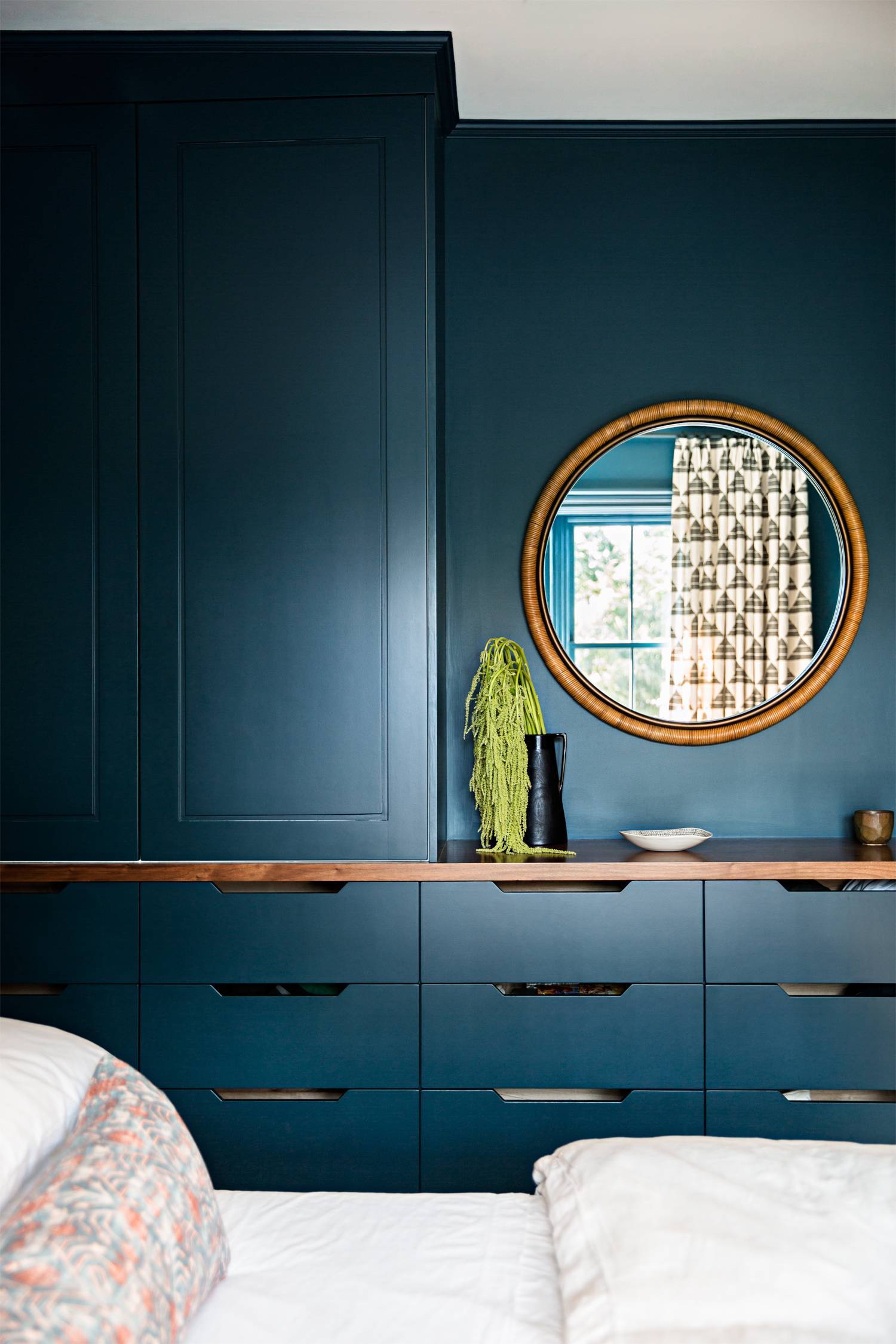 Если есть место для гардеробной, это идеально. Кстати, благодаря грамотному зонированию его вполне можно найти — выстроить дополнительную перегородку из гипсокартона и организовать там системы хранения. Возможности зависят от изначальной планировки квартиры и площади.
