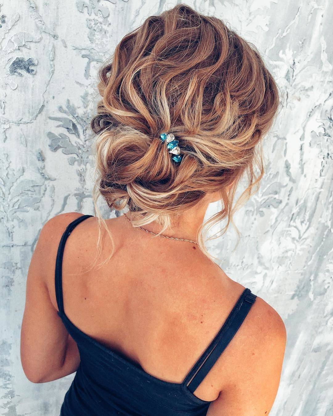 Свободный и объемный с выпущенными боковыми прядями или более строгий — для торжественных случаев выбирайте вариант укладки на макушке, для повседневных целей — средний или низкий пучок.