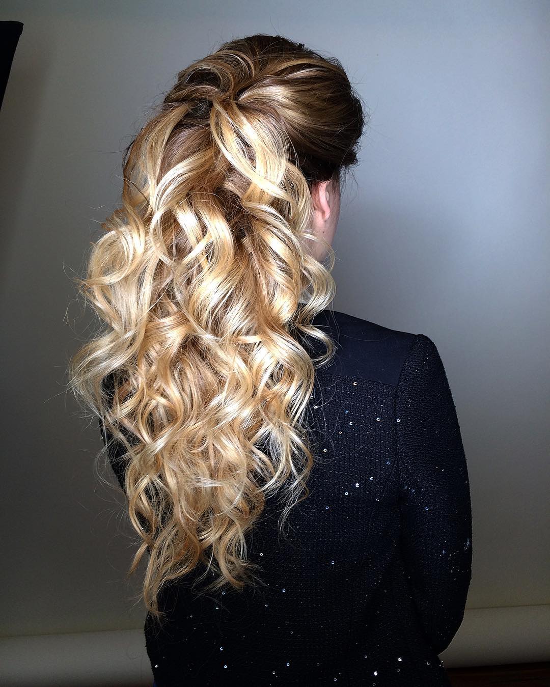 Кудри или волны — отличный повод без труда создать актуальный в этом сезоне пышный хвост. Для придания укладке небывалого объема отделите небольшое количество волос в области темени и соберите их в хвост. И уже после этого соедините с остальными волосами.