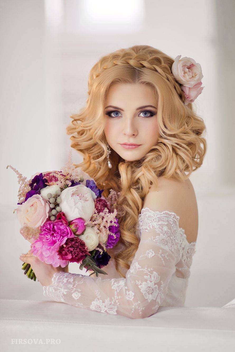 Если требуется создать романтичный образ невесты, следует обратить внимание на прическу с локонами. Распущенные волосы накрутить по всей длине или только на концах, хорошо зафиксировать профессиональным лаком, не склеивающим пряди