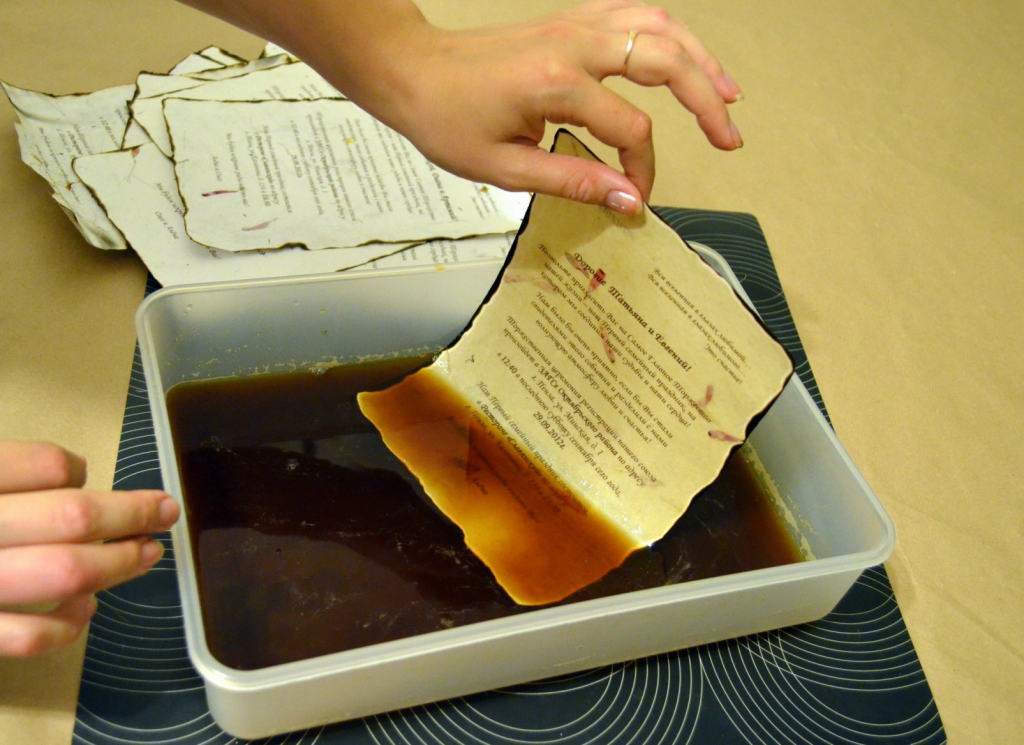 - Старим бумагу. Для этого помещаем в емкость с чаем и отмачиваем, подсушиваем. Затем старим еще больше, сажая чернильные кляксы. Сушим феном.