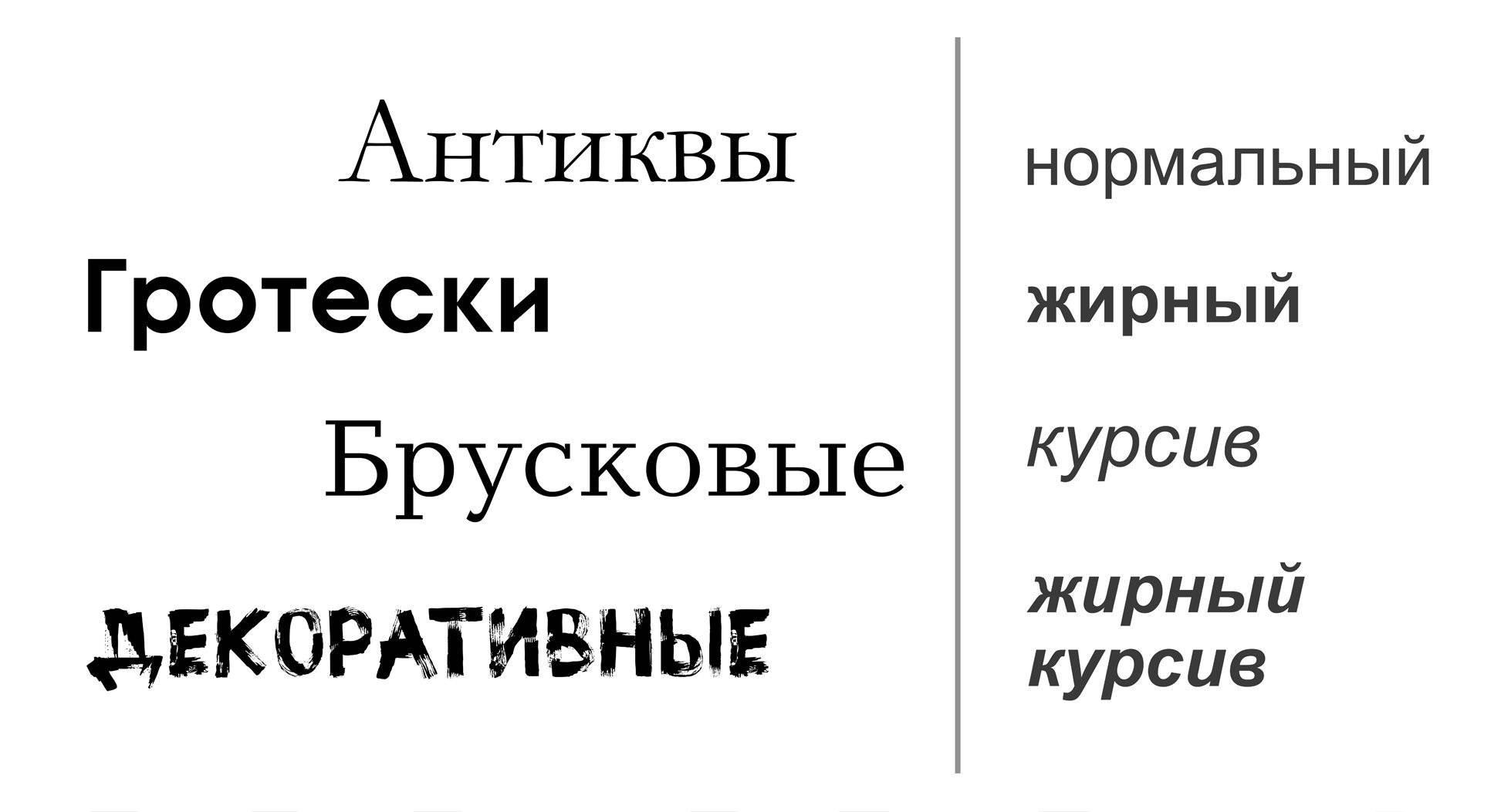 Бывают группы гарнитур с обычными засечками, с рублеными засечками, без засечек, а также декоративные шрифты, не подходящие ни под одно из описаний. В большинстве гарнитур есть разные варианты начертаний. Курсивные, жирные, жирные курсивные… Полужирные, полужирные курсивные… Тонкие, тонкие курсивные… В результате в нашем арсенале — бесконечное множество вариантов.