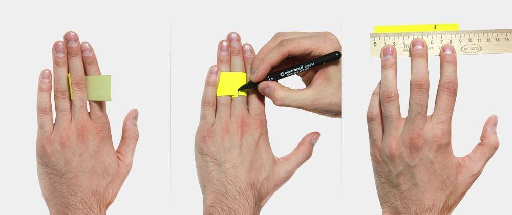 Наиболее легкий, однако надежный метод – надеть кольцо-образец на собственный палец и отметить ручкой в месте, где оно крепко садится. Затем в ювелирном возможно попросту примерять кольца при поиске аналогичных по габаритам.